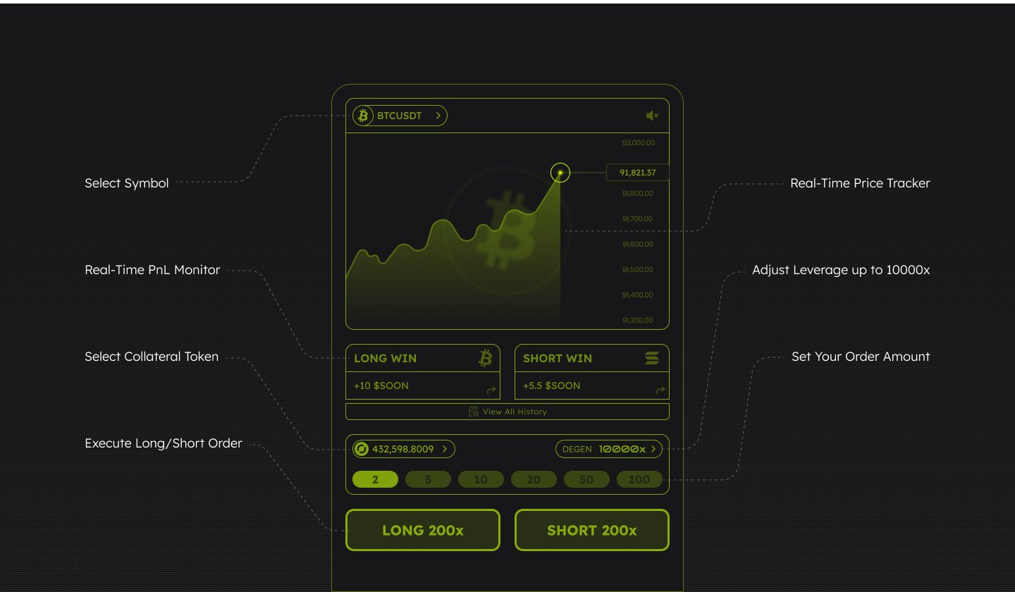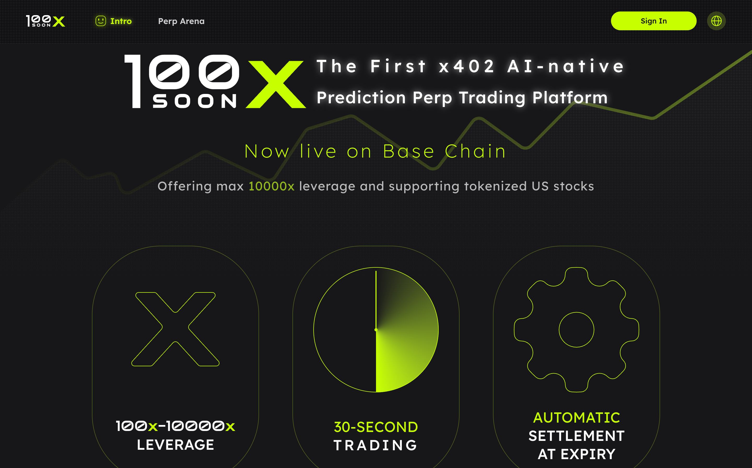 100XSOONは、x402を用いてAIエージェントが資金決済を行う、30秒後の価格をロング/ショートで予測する超短期・超高レバレッジ(最大10,000倍)取引プラットフォーム。