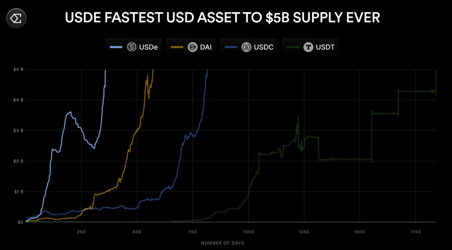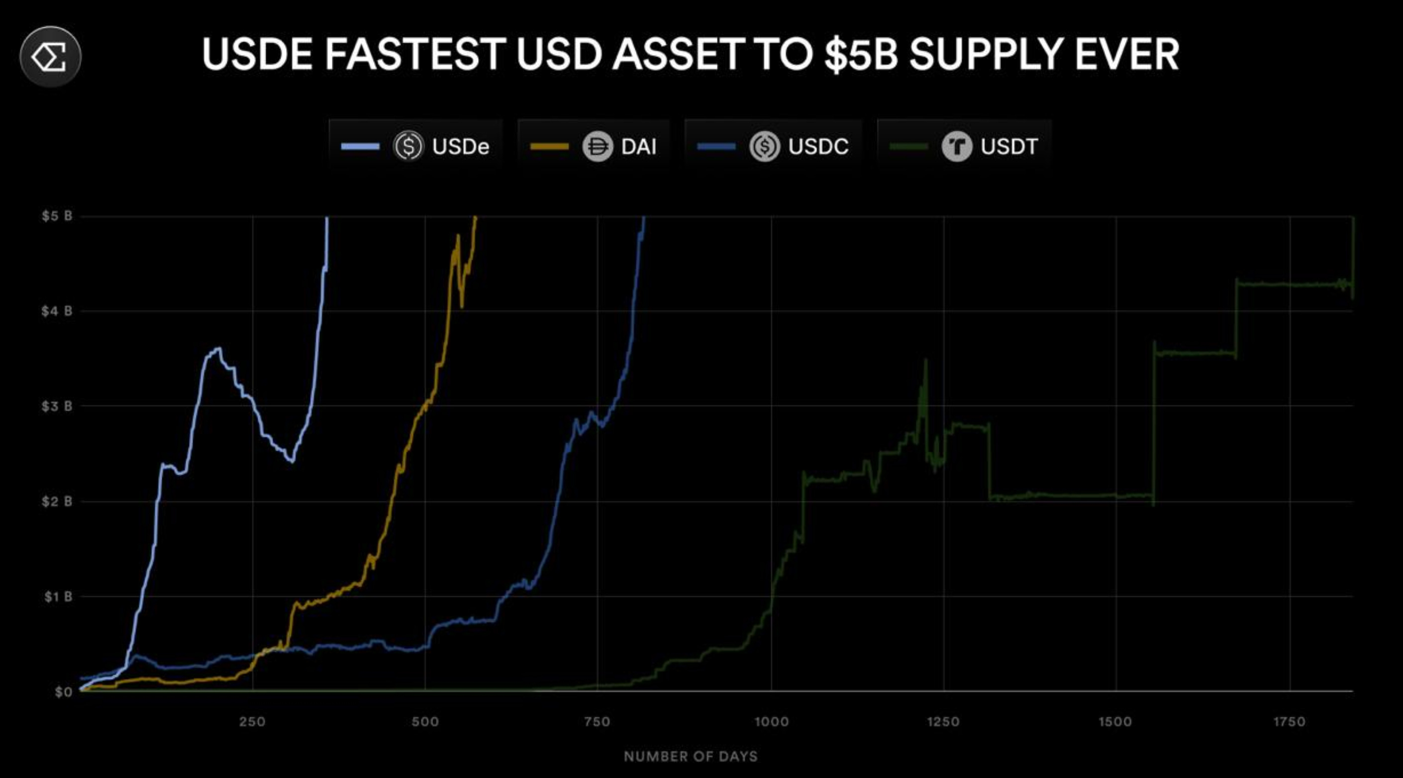 特にステーブルコインUSDeは最も早く$5Bに達したステーブルコインであり、その勢いは衰えていません。