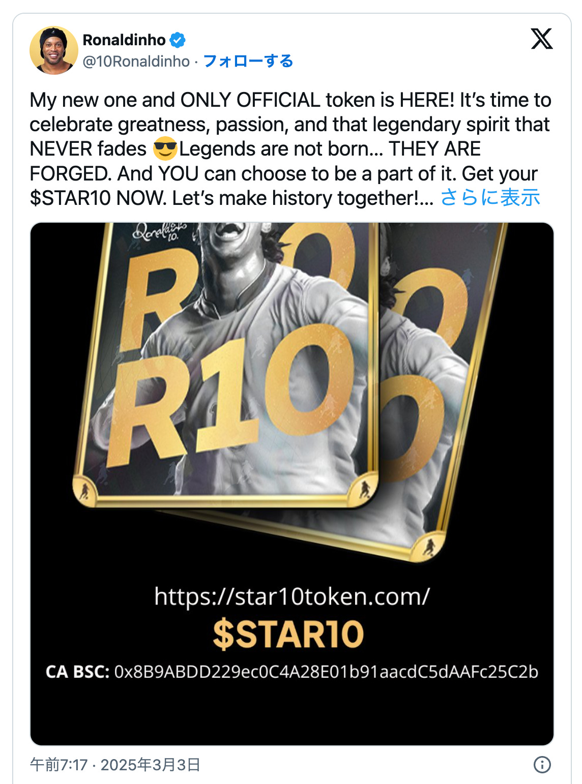 サッカー元ブラジル代表のロナウジーニョが、公式トークン「STAR10」をBSC上で発行開始した