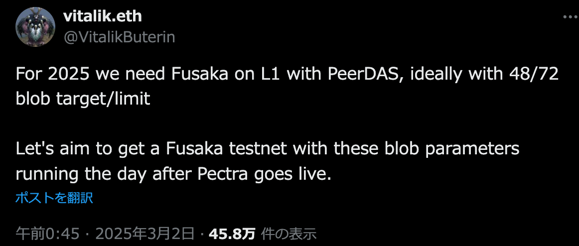 2025年中に、「Fusaka」をPeerDASと一緒に実装する必要があるとしている