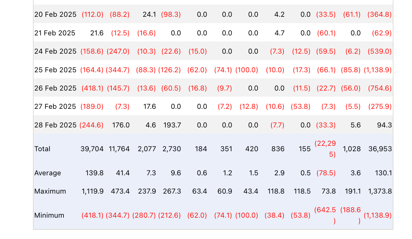 8日間続いた資金流出は止まったものの、9430万ドルの純流入は、2月18日から27日にかけて発生した総額32億6000万ドルの流出に比べるとわずかな額だった