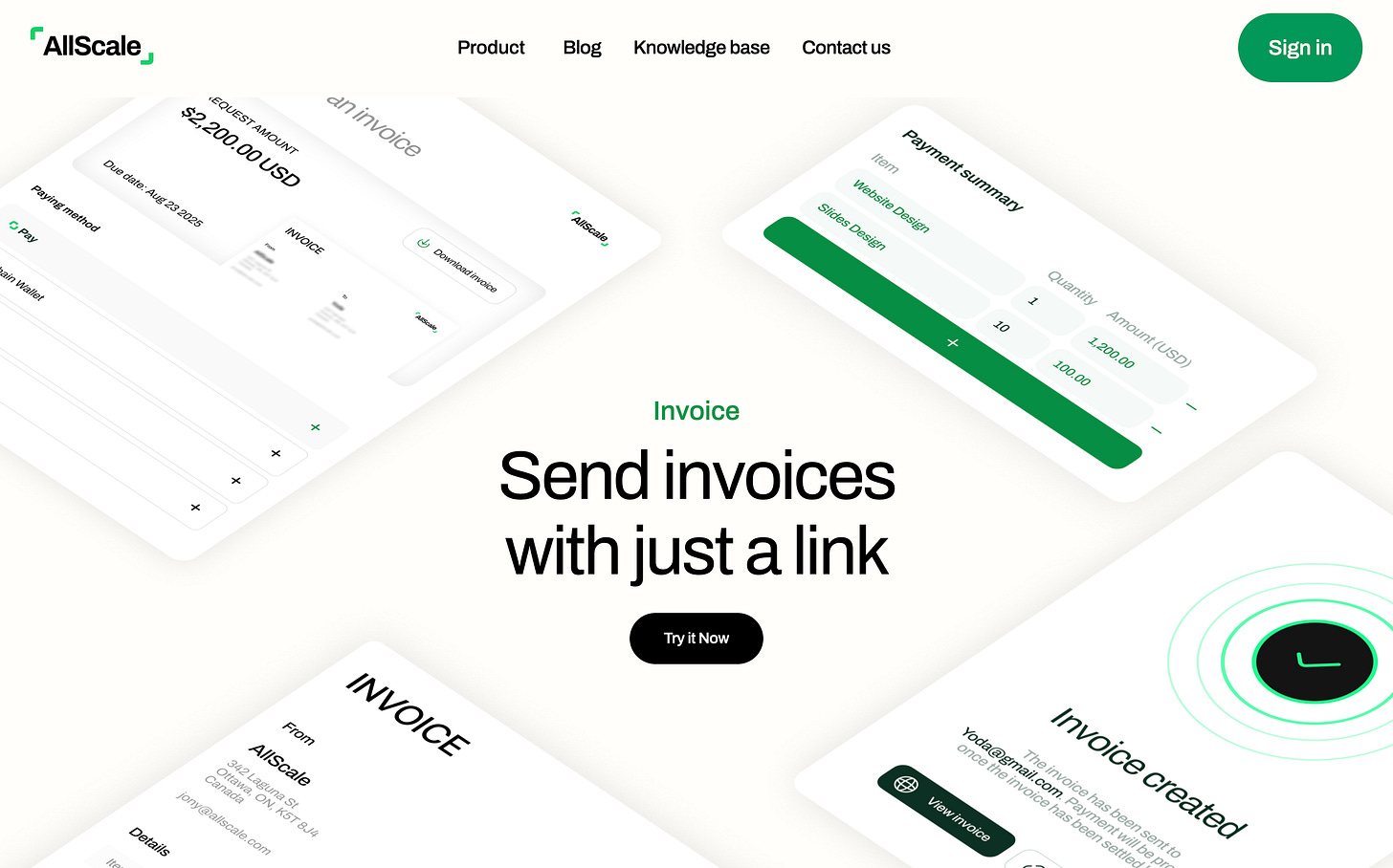 ユーザーはAllScale上で自分のサービスや製品を掲載したカスタマイズ可能なプロフィールページを作成でき、そこに注文フォームを設置することで、閲覧者は希望の内容で支払いリクエストを送信できます。支払リンクを経由して送られたリクエストは自動的に請求書に変換され、オーナー(クリエイター)はそれを承認するだけで即座に支払いを受けることができます。