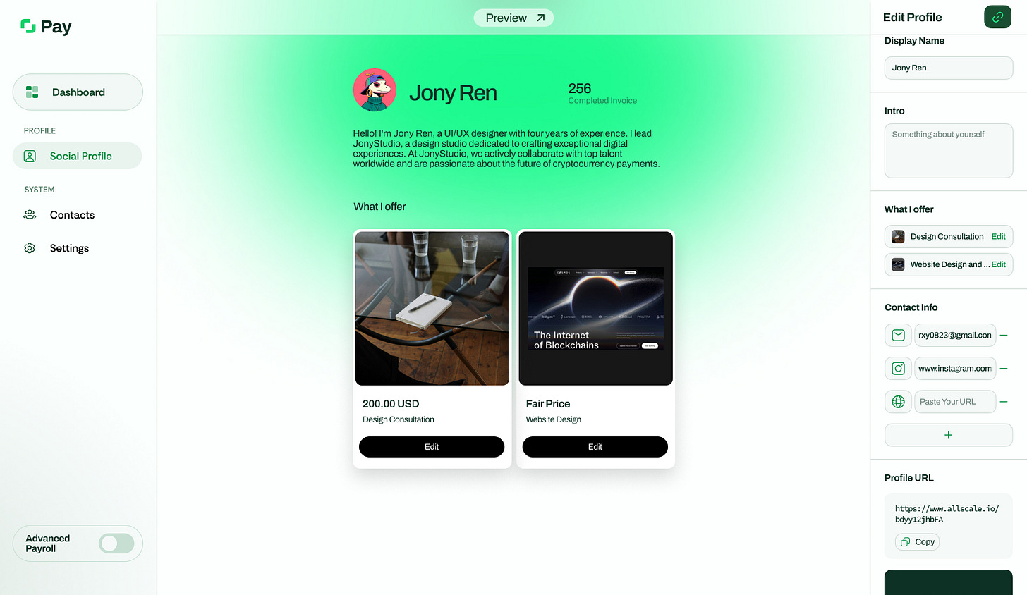具体的には、請求書発行(Invoicing)、グローバル給与支払い(Payroll)、ソーシャルコマース(AllScale Pay)といったプロダクトを一体化した「オールインワン」のサービスを展開しています。