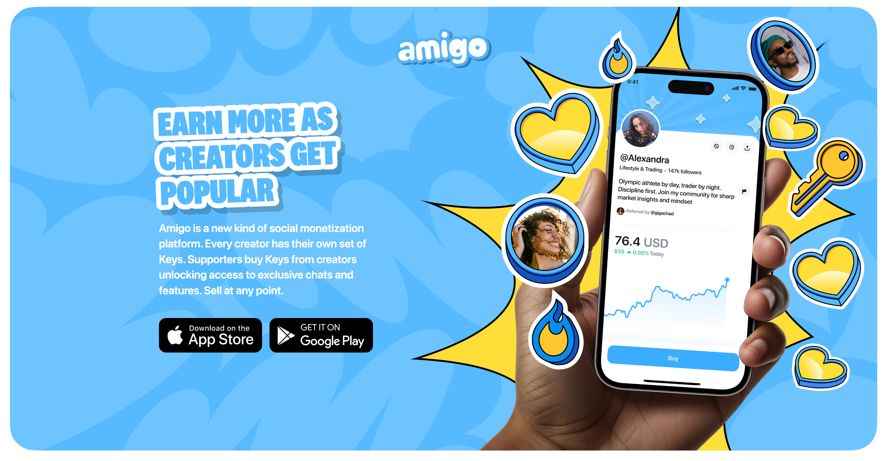 AmigoはAbstract上のSocialFiアプリで、クリエイターが発行した「キー」をファンや投資家が売買し、成長や人気に応じて価値が上がる仕組みです。