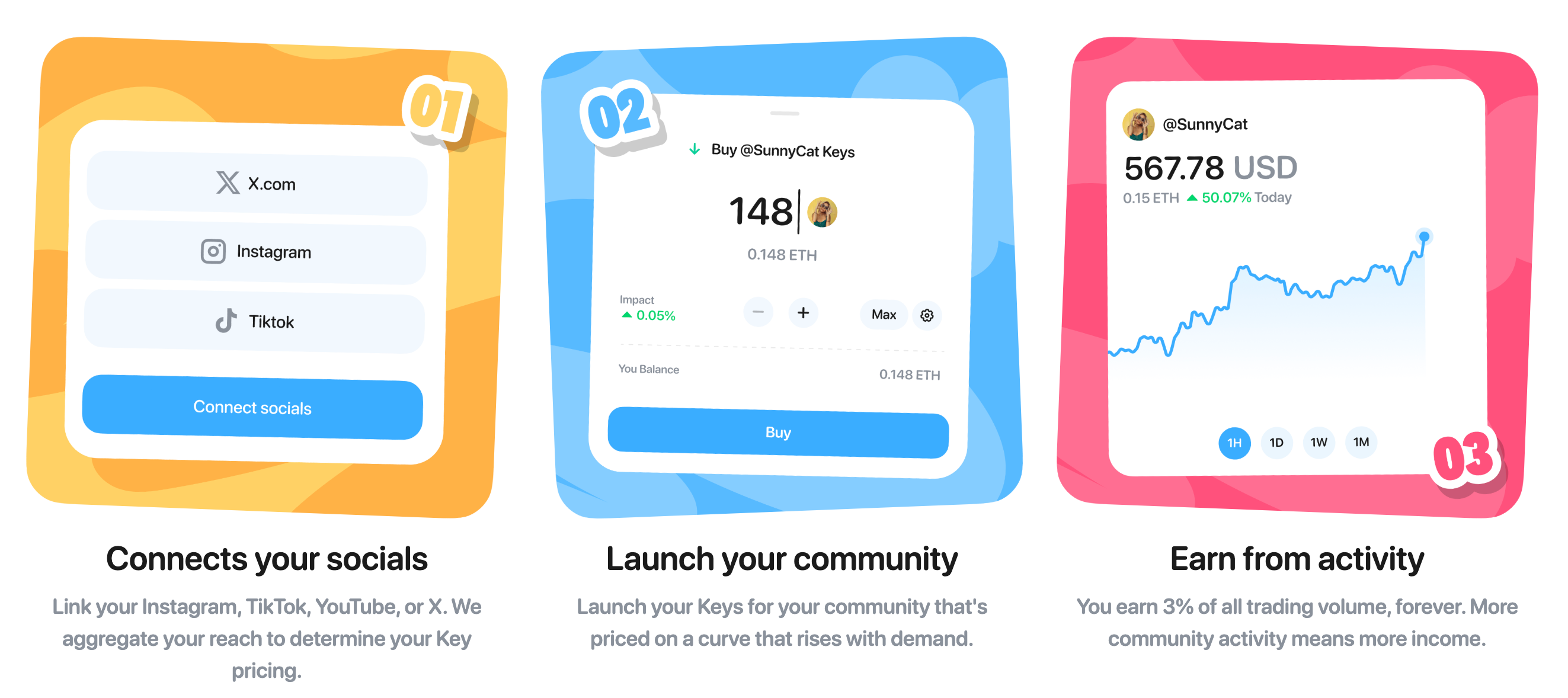 クリエイター側はX、Instagram、TikTokのSNSアカウントをリンクすることでアカウント作成が可能で、キー価格は購入数に加えて、インプレッションやエンゲージメント等と連動して上昇していきます。