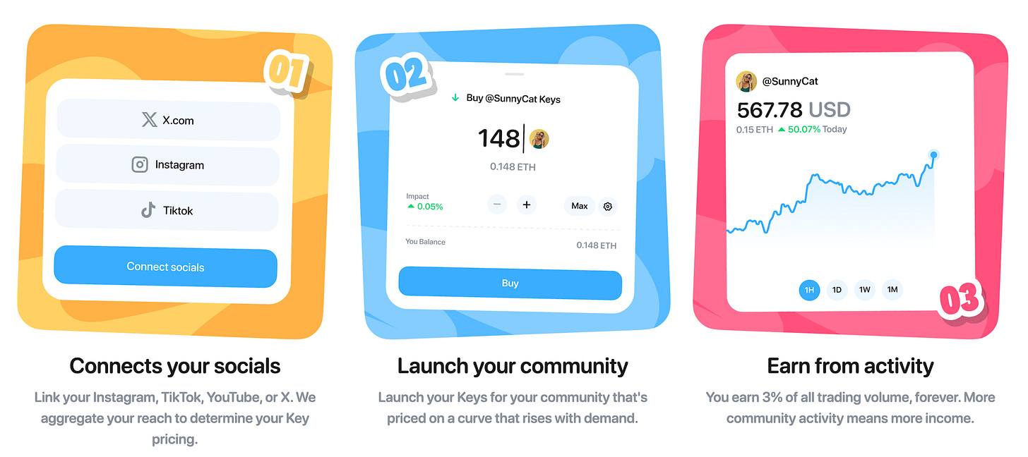 キー保有者は限定コンテンツやチャット参加などの特典を得られ、クリエイターの成功をファンも経済的に共有できる設計が特徴です。