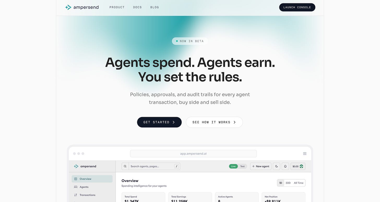 Ampersendは、The GraphチームのEdge & Nodeが開発した「エージェント経済の制御レイヤー」で、AIエージェントの支出管理・収益管理・監査をひとつのプラットフォームで担う。