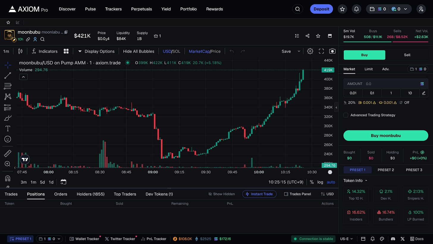 現物取引(スポット取引):Solana上の様々なトークンを即座にスワップできます。新規ローンチ直後のミームコインなども含め、「今熱い」トークンをワンクリックで買えるスポット取引が可能です。マーケット注文だけでなくユーザー希望価格での指値注文にも対応しており、独自の注文エンジンによりほぼ1ブロック内(数秒程度)での約定を実現しています。