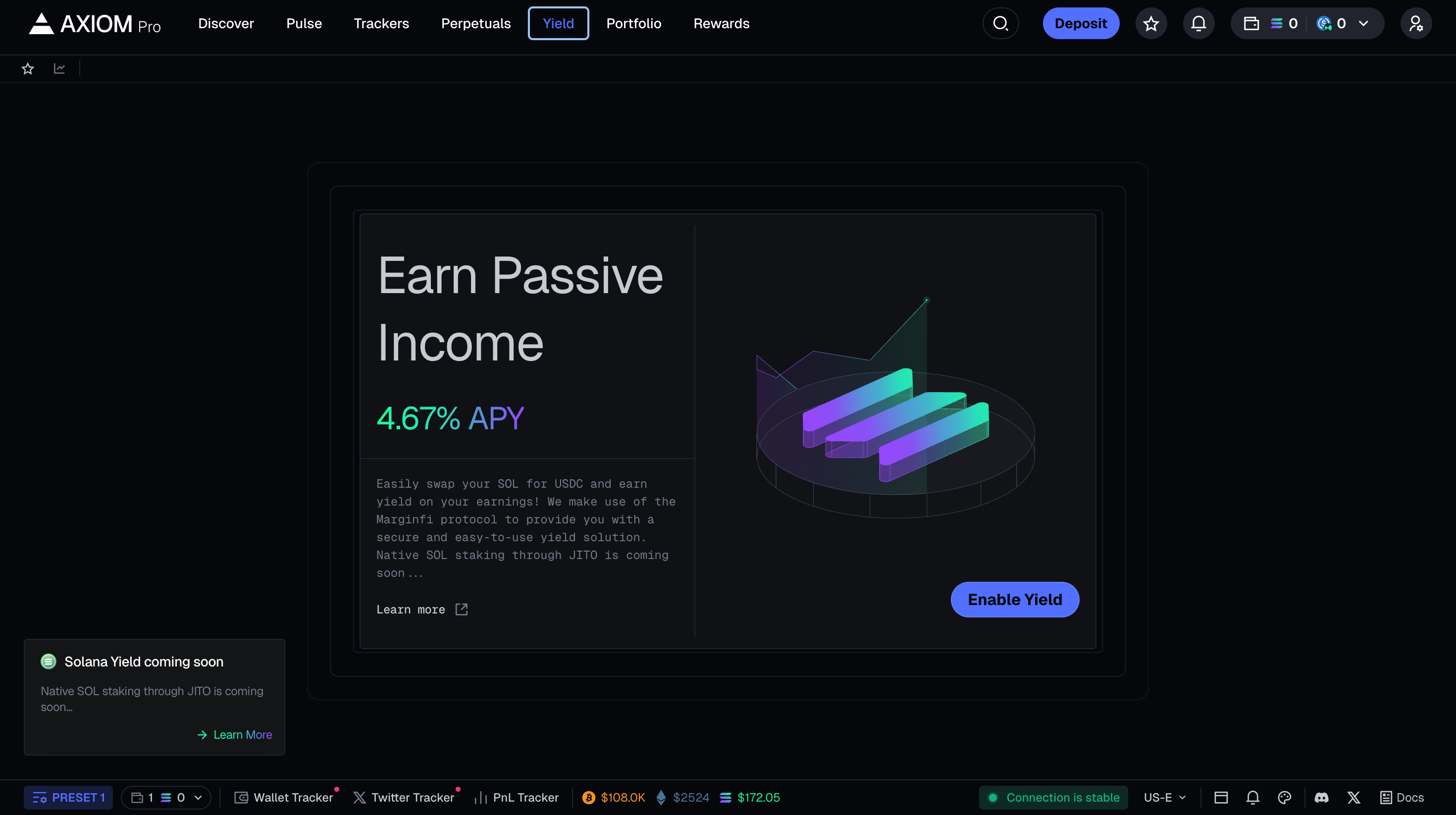 分析機能もX連携であり、今後拡充予定のステーキングもJito連携です。DeFiはコンポーザビリティが容易である点が特徴ですが、それら全てを統合し、1つの使いやすいインターフェースによってまとめた点に「Axiom」の特徴があります。