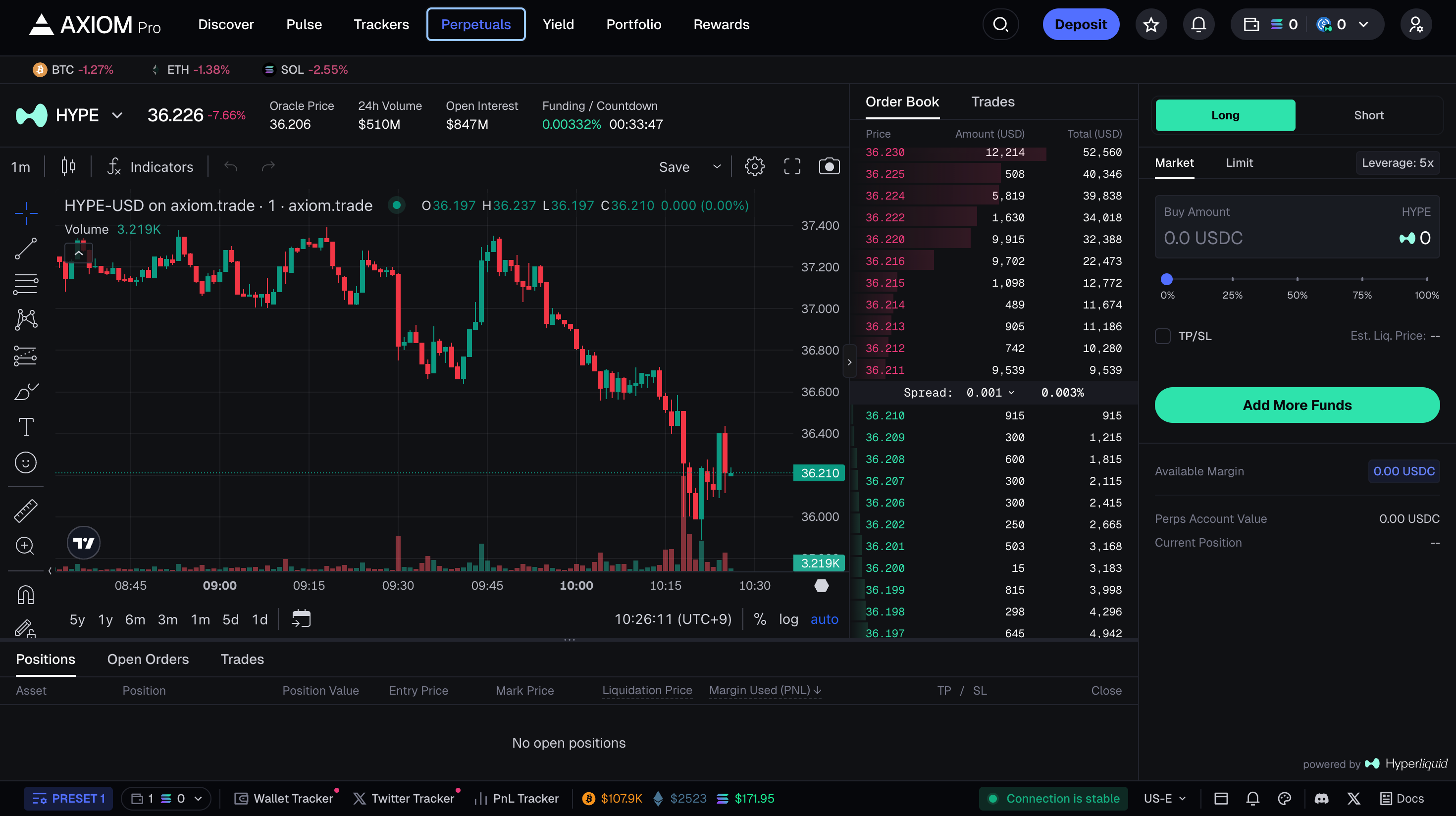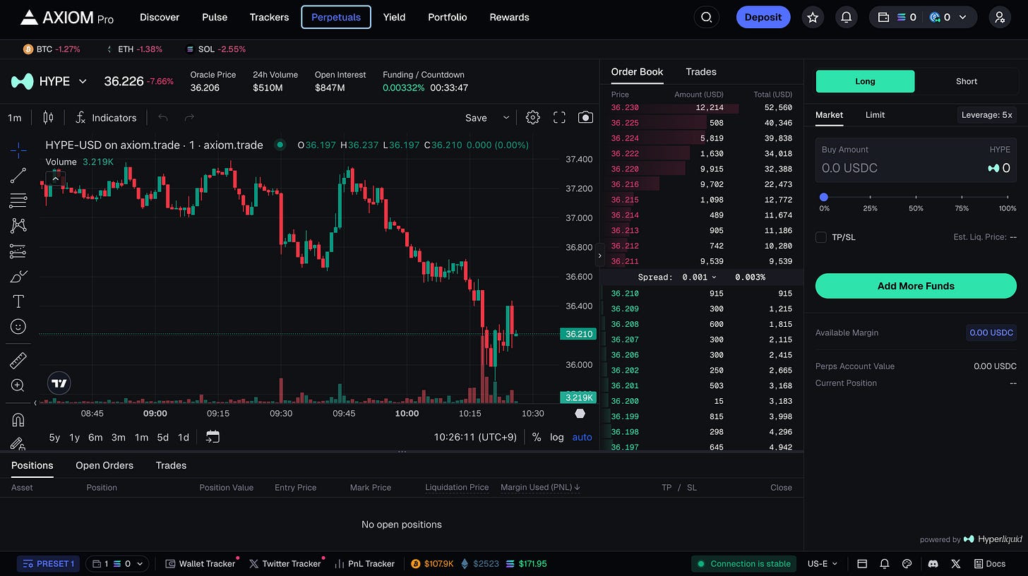 デリバティブ取引(永久先物):Hyperliquidを統合することで最大50倍のレバレッジをかけた永久先物取引を提供しています。Hyperliquidチェーン上での取引になりますが、Axiomのインターフェース上でシームレスに行えます。