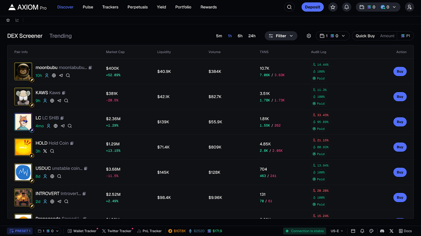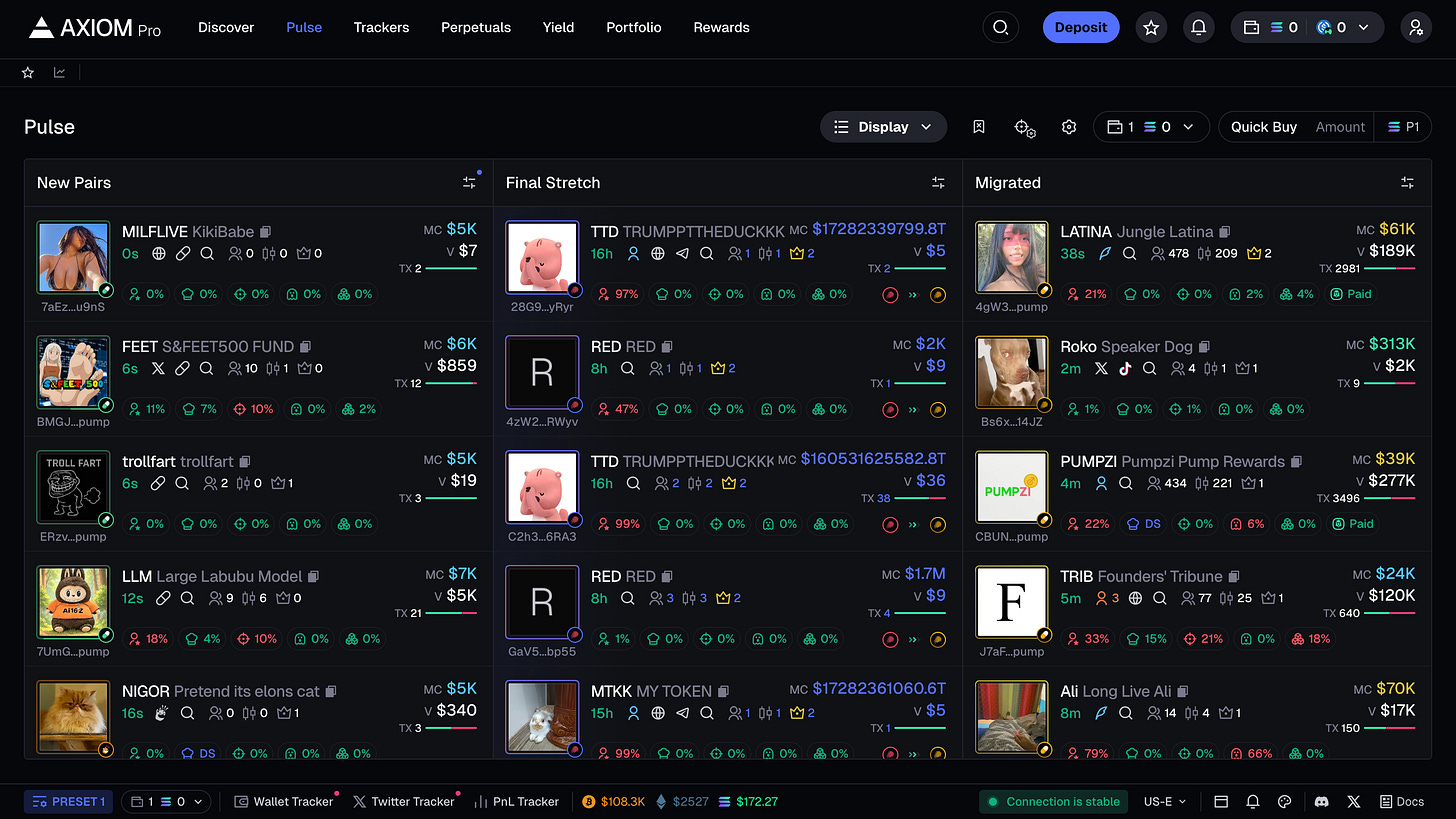 分析・情報収集ツール:上部のメニューには「Discover」「Pulse」などのタブがあり、市場分析機能が充実しています。「Discoverページ」では新規上場ペアやトレンド上昇中のトークンがランキング表示され、期間別の売買高急増銘柄などを追跡可能です。「Pulse」はPump.funにリストされているトークンが掲載されており、新しく作成されたトークン、まもなくボンディングカーブが100%に達しDEXに移行されるトークン、そしてDEXに移行したばかりのトークンが確認できます。