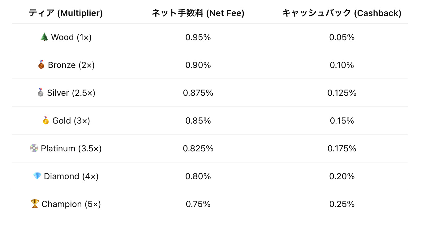この手数料率とキャッシュバック率は「Axiom」を利用することで貯まるポイントの量によって決まります。正確にはポイントが貯まるとティアが決定され、そのティアに応じて手数料とキャッシュバック率が決定します。
