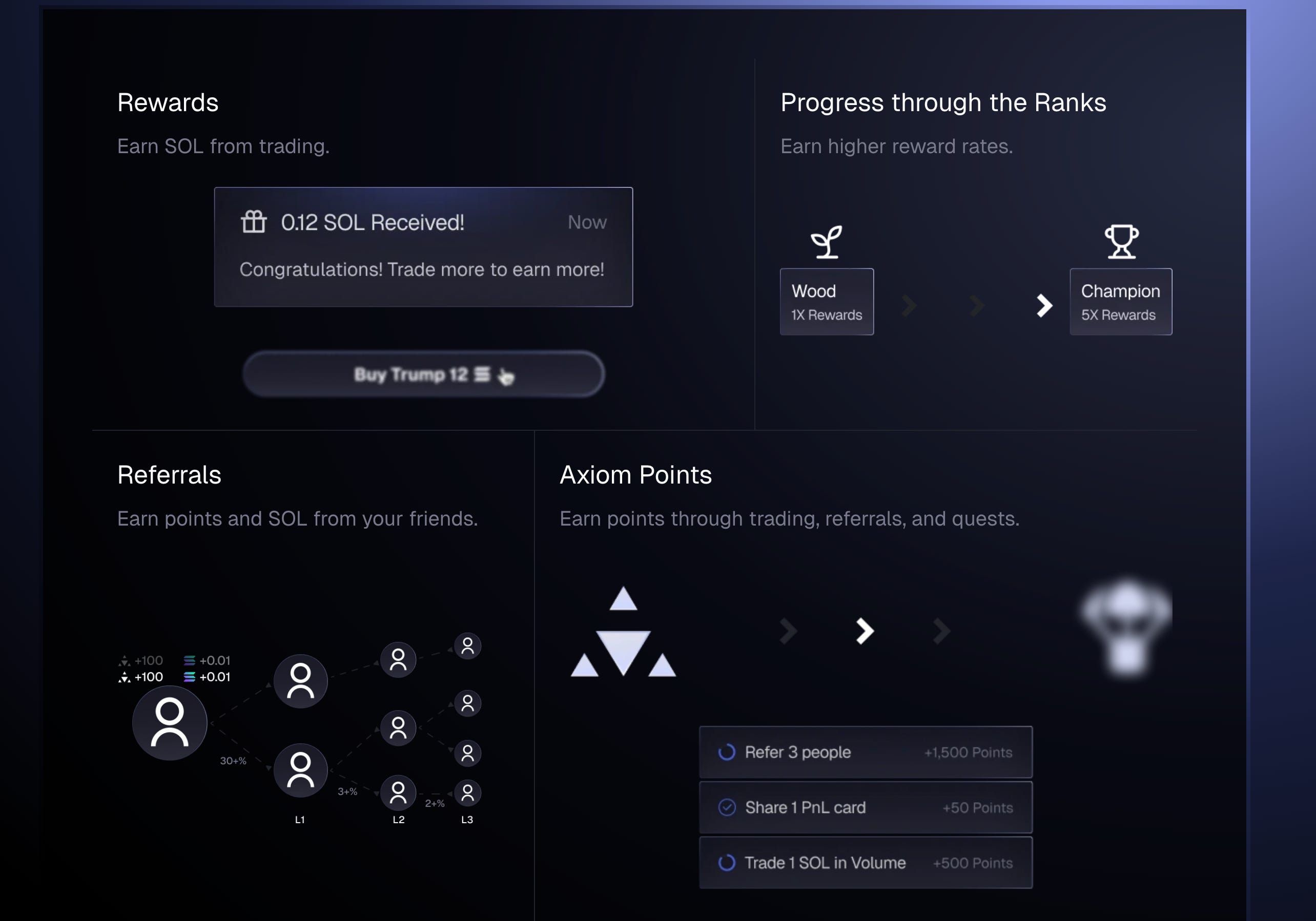 「Axiom」の標準の取引手数料は最大0.95%と設定されており、競合プラットフォーム(BullXやPhotonでは1%超)より安価です。さらに、取引手数料の一部がSOLでキャッシュバックされる仕組みも存在します。