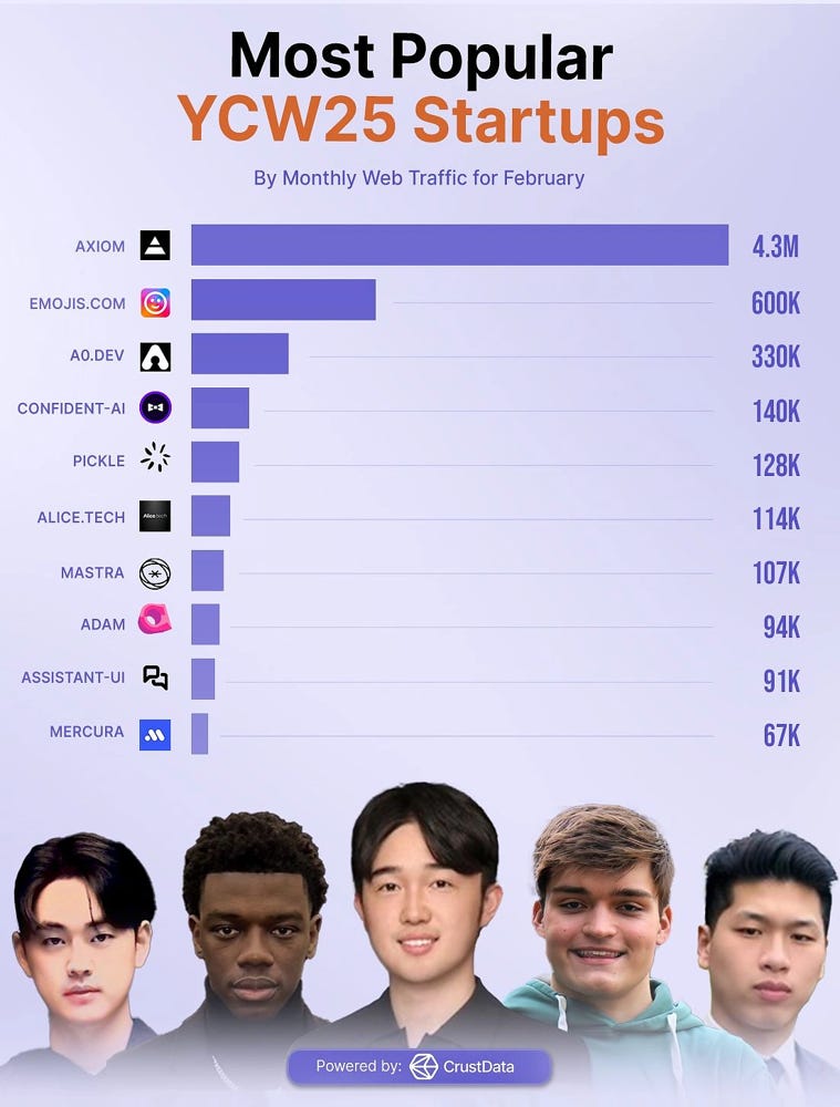 前述の通り、ローンチから数ヶ月でユーザーアクセスが爆発的に拡大しました。2025年2月時点の月間Webサイト訪問者数は約430万に達しており、これは同時期のYC W25バッチ採択企業中トップの値です。