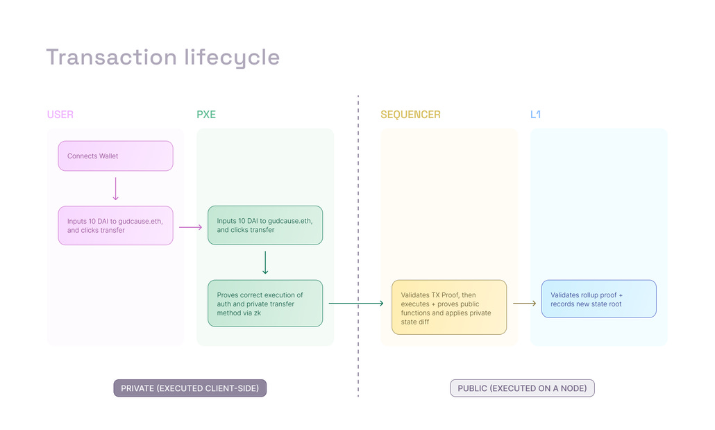 全体像を雑に言えば、ユーザーのトランザクションはまず秘密環境下(PXEと表現)で実行され、そのzk証明がパブリックネットワークに届きます。ここでAztec側のノードが検証、ロールアップしてL1であるイーサリアムにコミットします。
