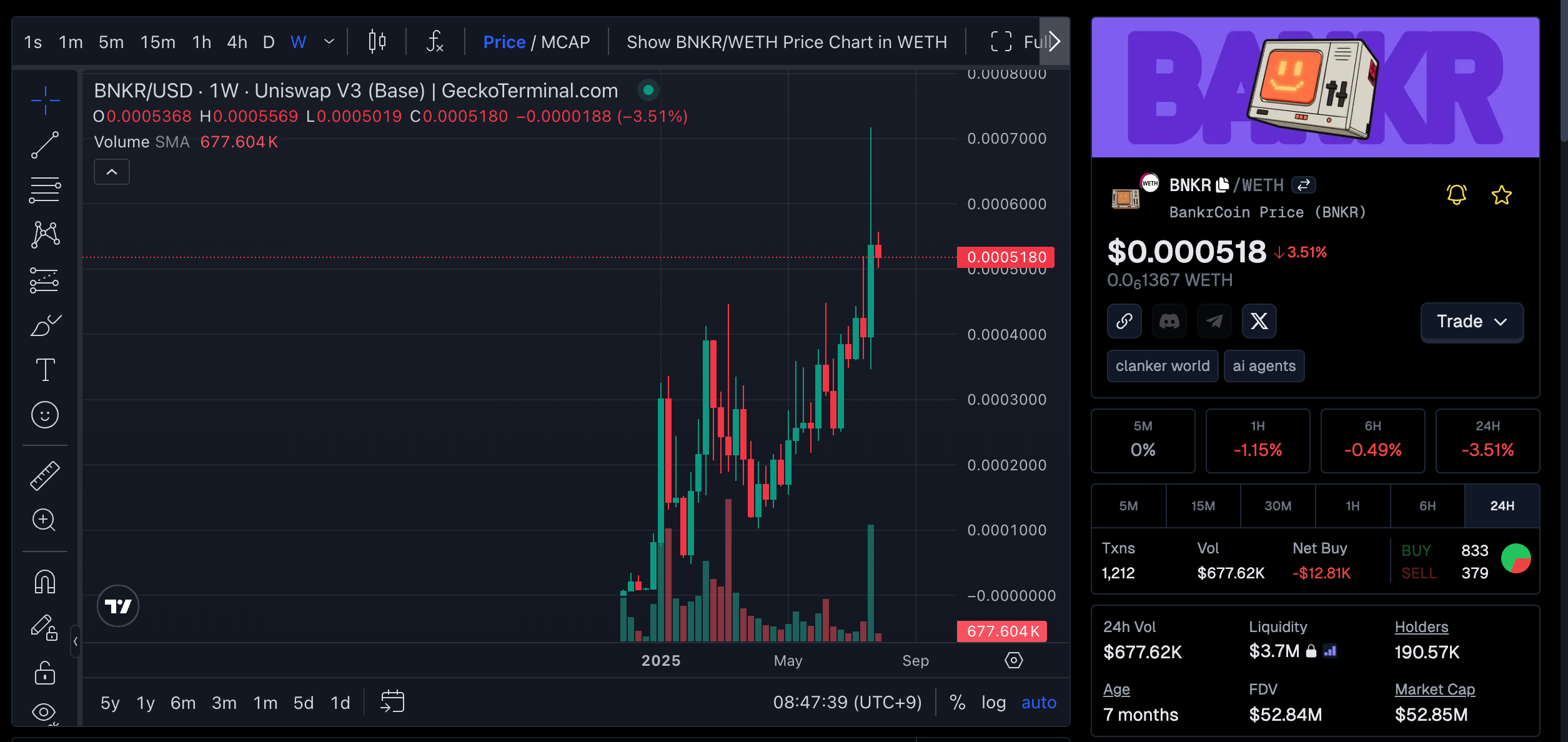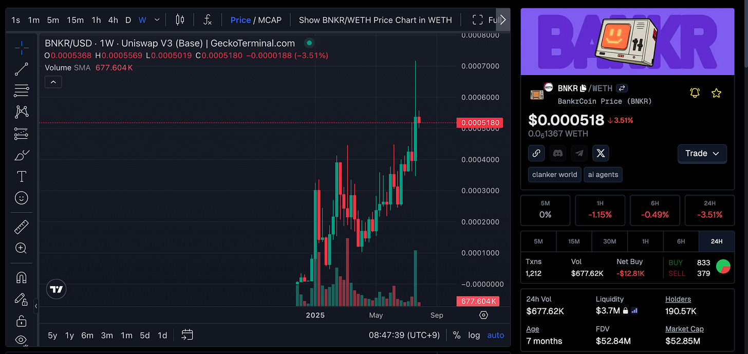 Bankrは独自トークンの「$BNKR」を発行しています。「$BNKR」はFarcasterソーシャルフィードでclankerを利用してローンチされました。