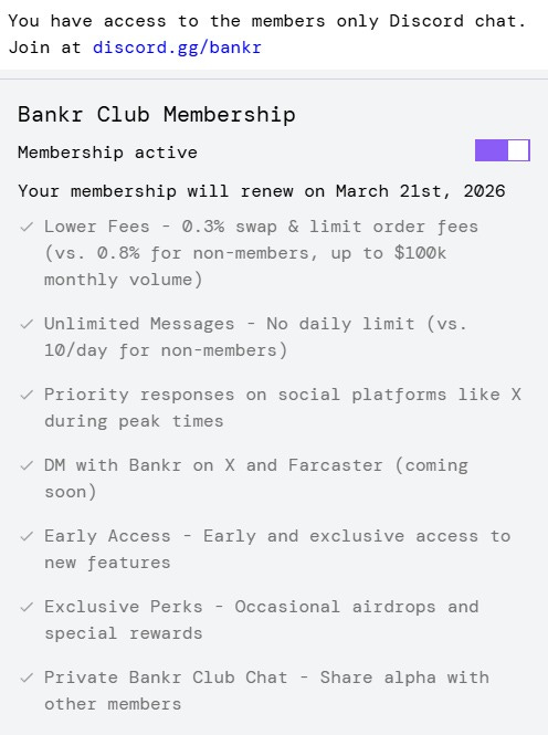 「Bankr Club」に入ることで、取引手数料の割引(通常0.8%が0.3%に)、メッセージ利用回数の無制限化、ネットワーク混雑時の優先処理、さらにアルファ版の新機能への先行アクセスや限定NFT報酬の獲得などが挙げられています。