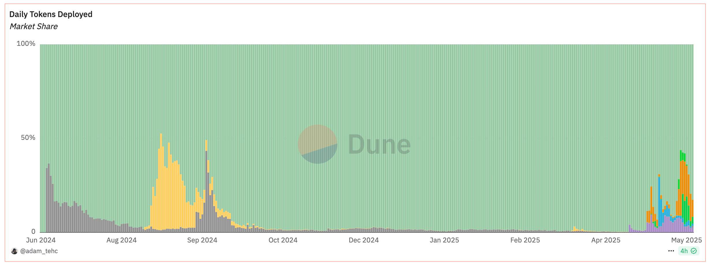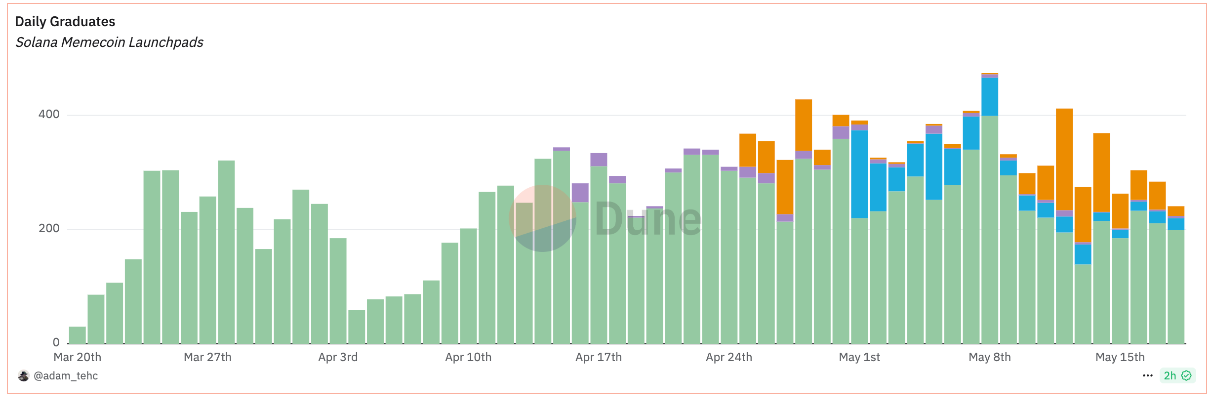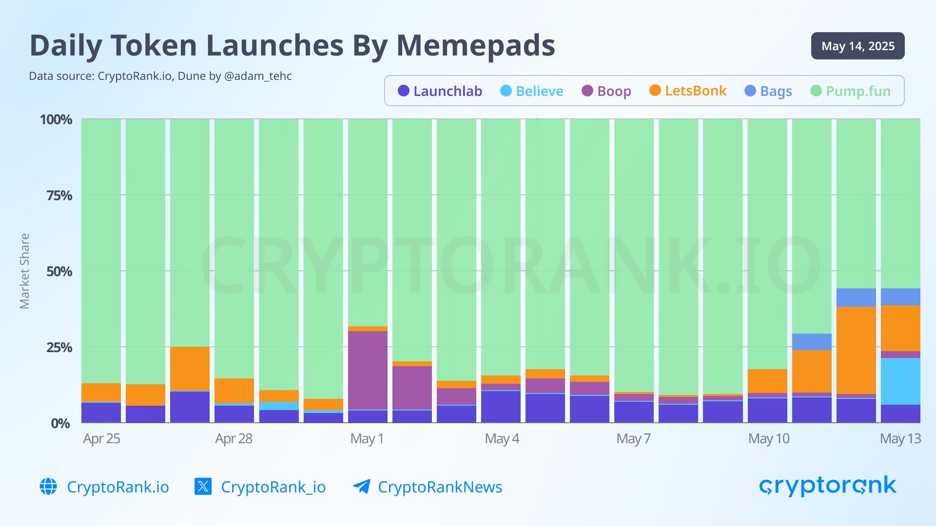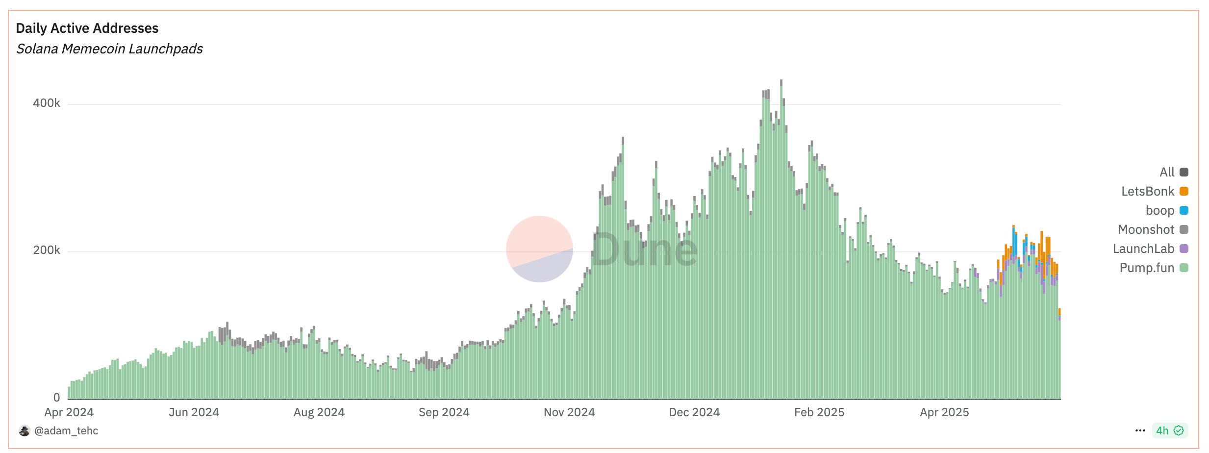 他のローンチパッドと比較すると、以下の通りです。Pump.fun一強であったシェアが直近オレンジ色のLetsBonkと濃い緑のBelieveに奪われていることがわかります。