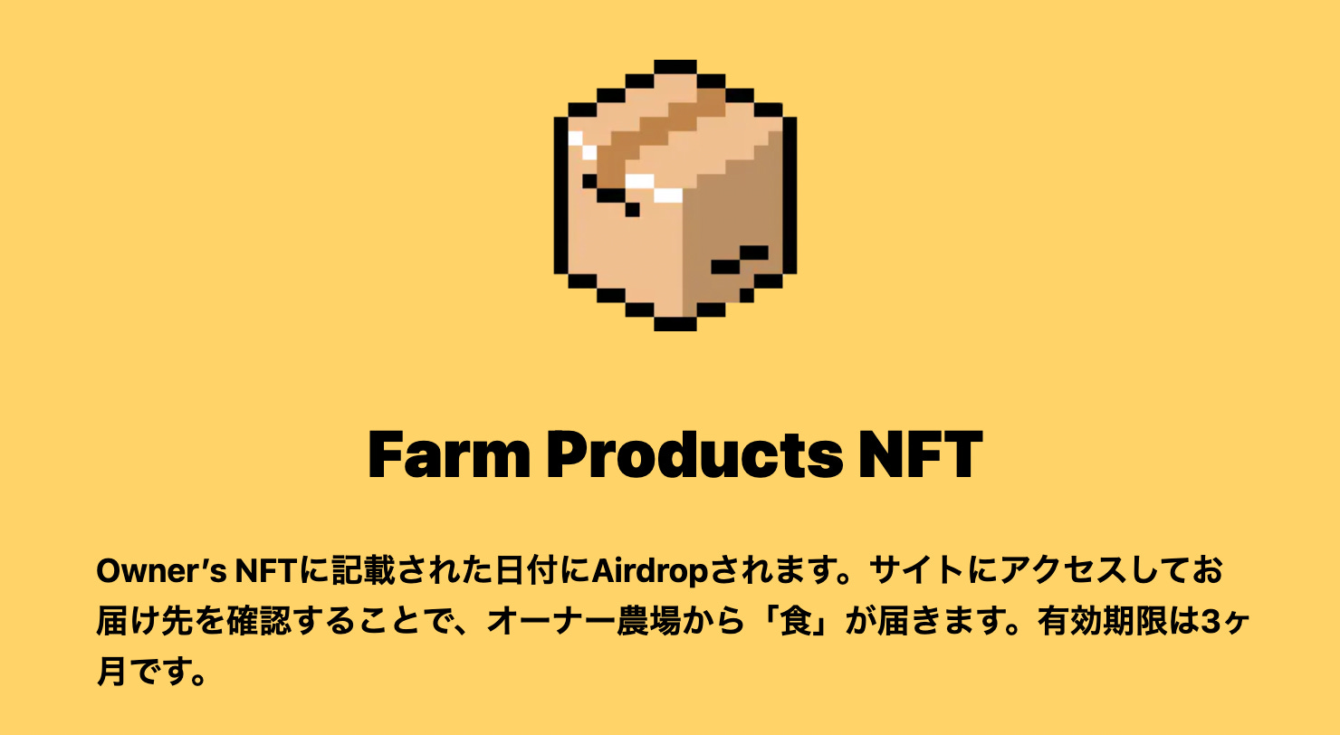 農家さんに対して、単発的な支援ではなく、継続的な支援となるように農場オーナー権のNFTと食のNFTを分割しての販売となっています。また、NFTであることで、認知拡大やマーケティングが苦手な農家さんの情報をホルダーさんも一緒になって伝えてくれるのではないかという構想のもと運営されています。