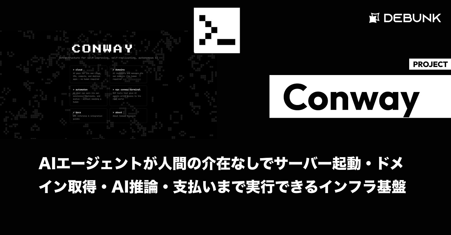 Conwayは、AIエージェントが人間の介在なしでサーバー起動・ドメイン取得・AI推論・支払いまで実行できるインフラ基盤。