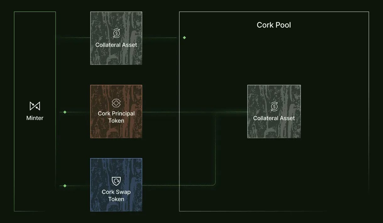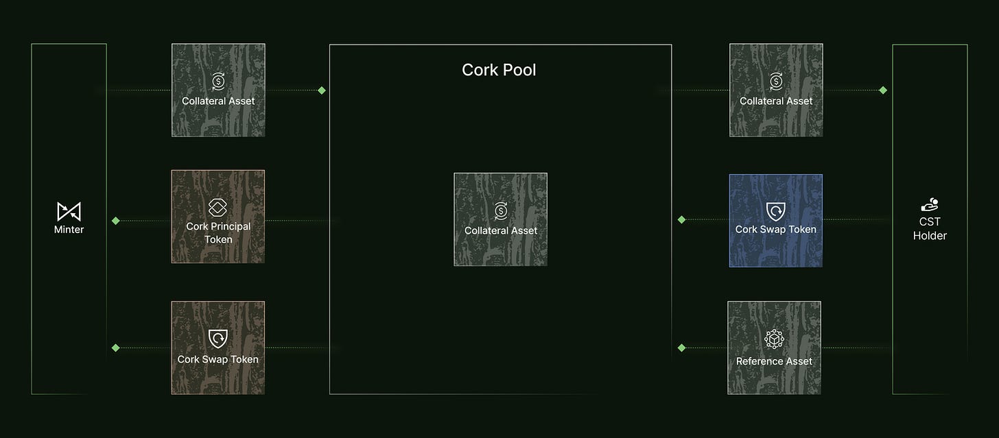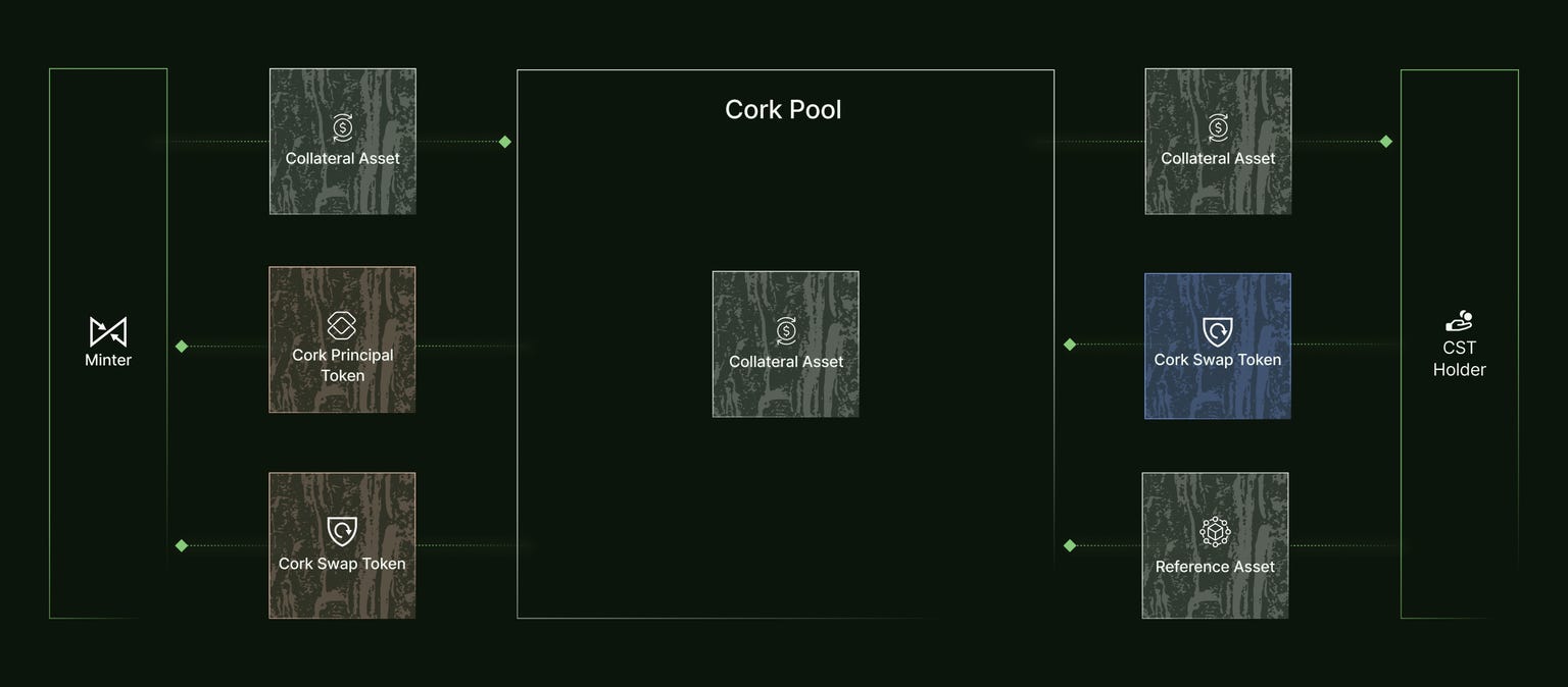 Collateral Assetを預け入れると「Cork Principal Token(cPT)」と「Cork Swap Token(cST)」がそれぞれミントされます。cPTはプールの保険引受人向けトークンで、利回りの代わりにリスクを持ちます。cSTは保険・デペグ時交換権を持つトークンです。
