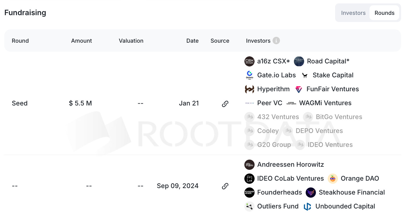まず2024年9月にa16zの主催する暗号資産アクセラレーター「Crypto Startup School(CSX)」秋コホートに採択され、それに伴い約215万ドルのシード資金を調達しています。このラウンドにはa16z Cryptoのほか、OrangeDAOやIDEO Ventures、Outliers Fund、Unbounded Capital、Steakhouse Financialなど複数のweb3投資家が参加しました。