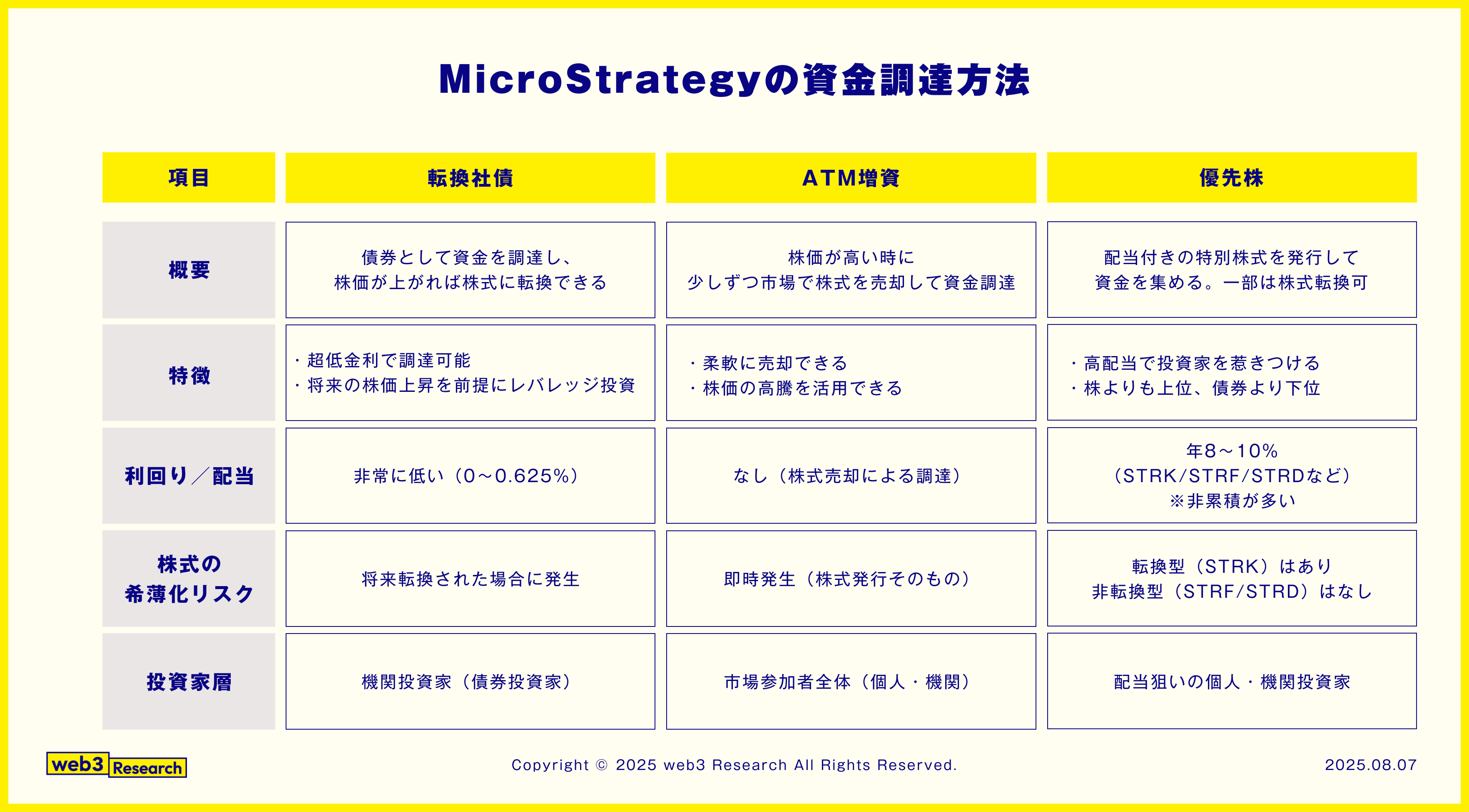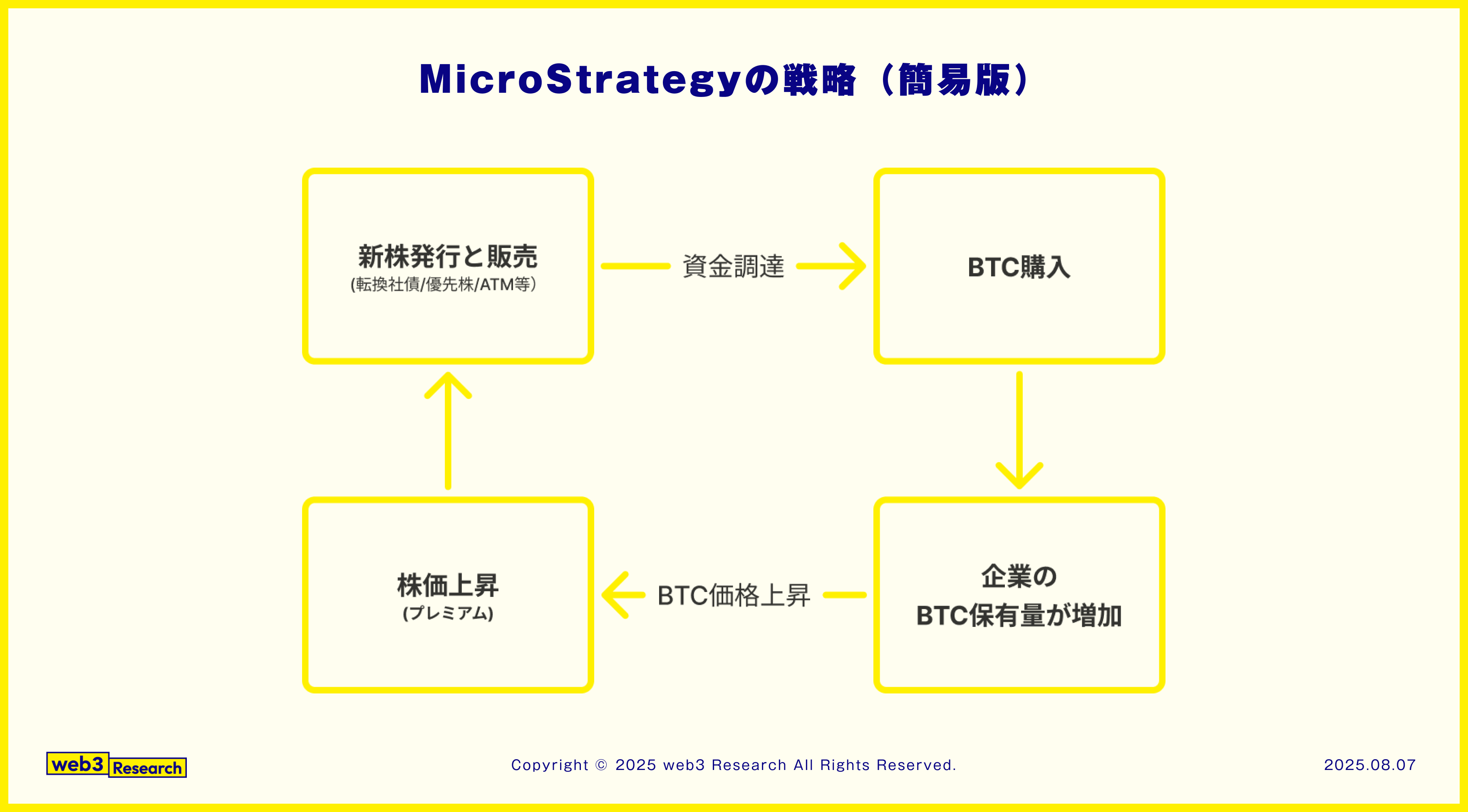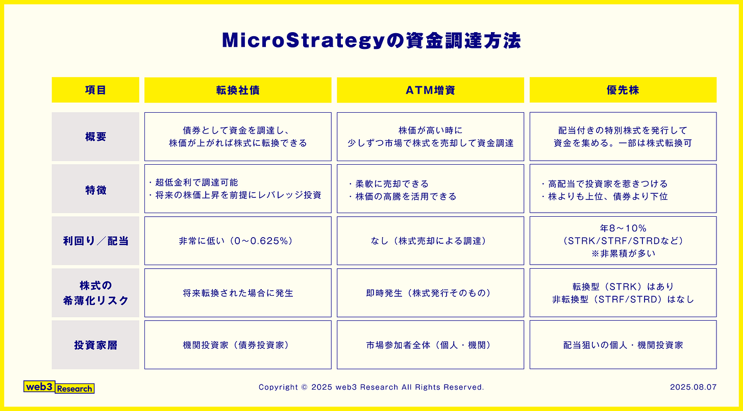 MicroStrategyは「BTCを買い続ける上場企業」として株式を活用し、転換社債・ATM増資・優先株などを通じて資金を調達し、BTCを積み増す独自戦略を展開している。