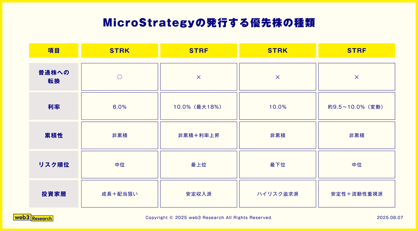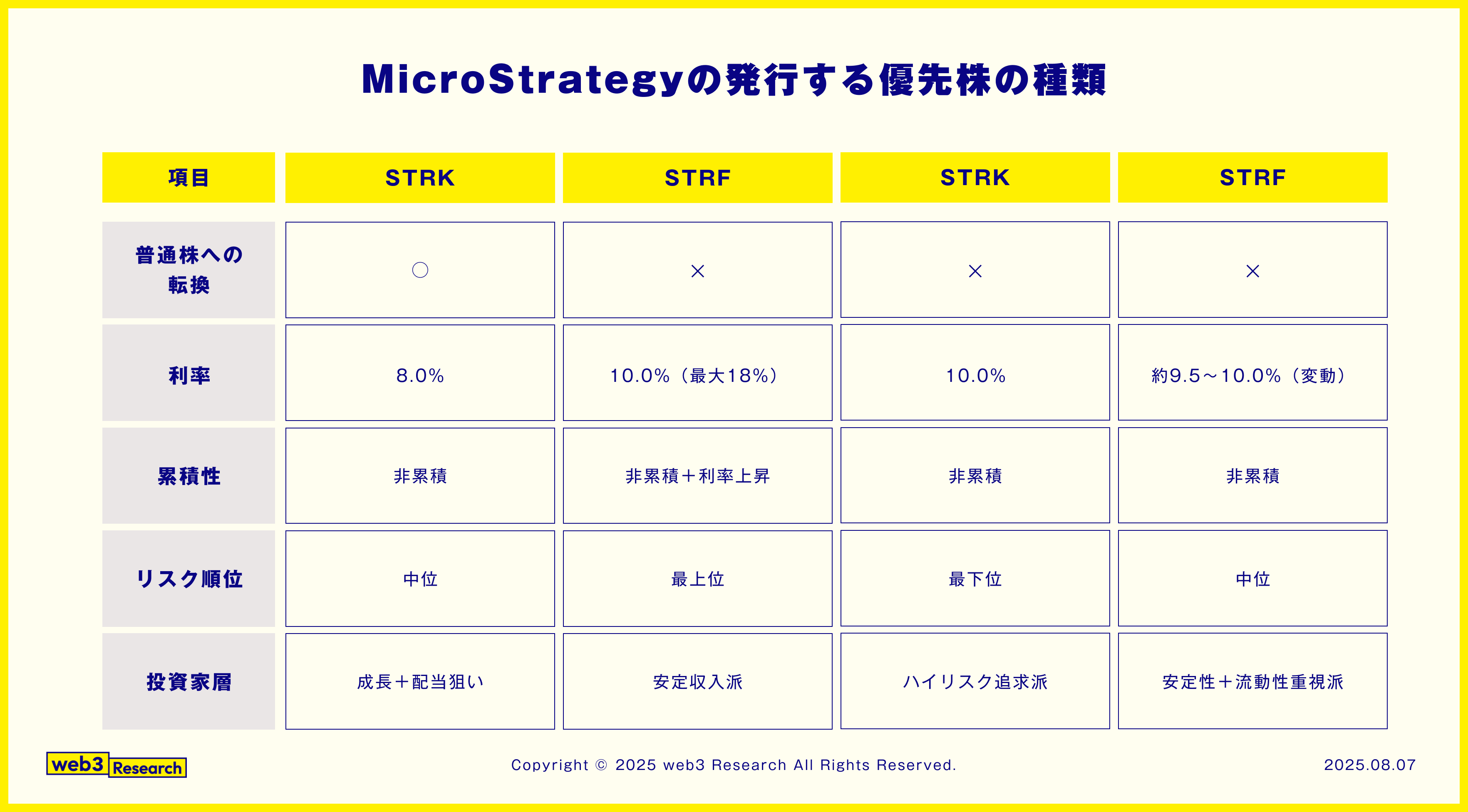 転換権の有無で性質が異なる:STRKは転換可能(株式に変更できる)、STRFとSTRDは非転換(普通株にならない)です。
