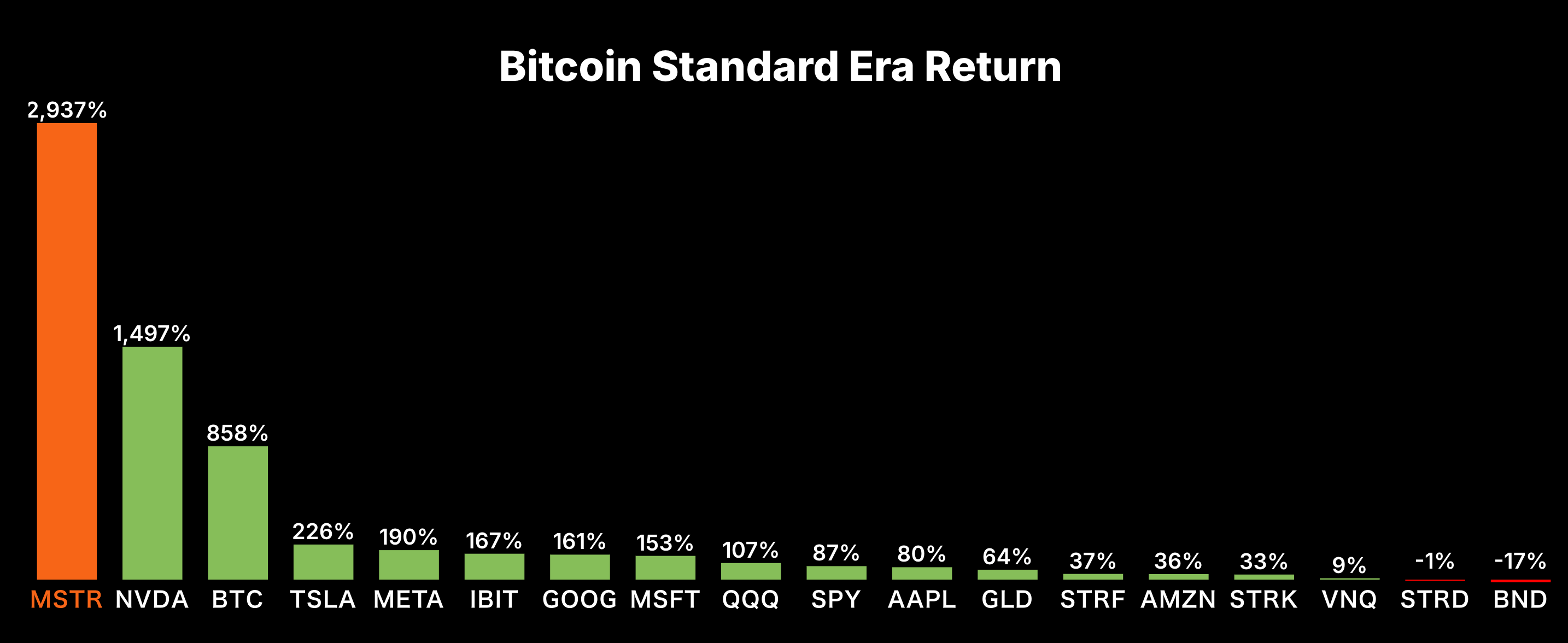 この戦略は市場から大きく評価されており、MSTR(MicroStrategy株)の購入は過去5年間でNVDA株(Nvidia)よりもBTC現物よりも遥かに大きなリターンを出しています。