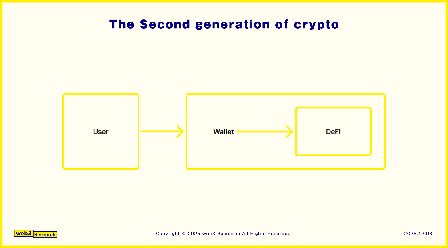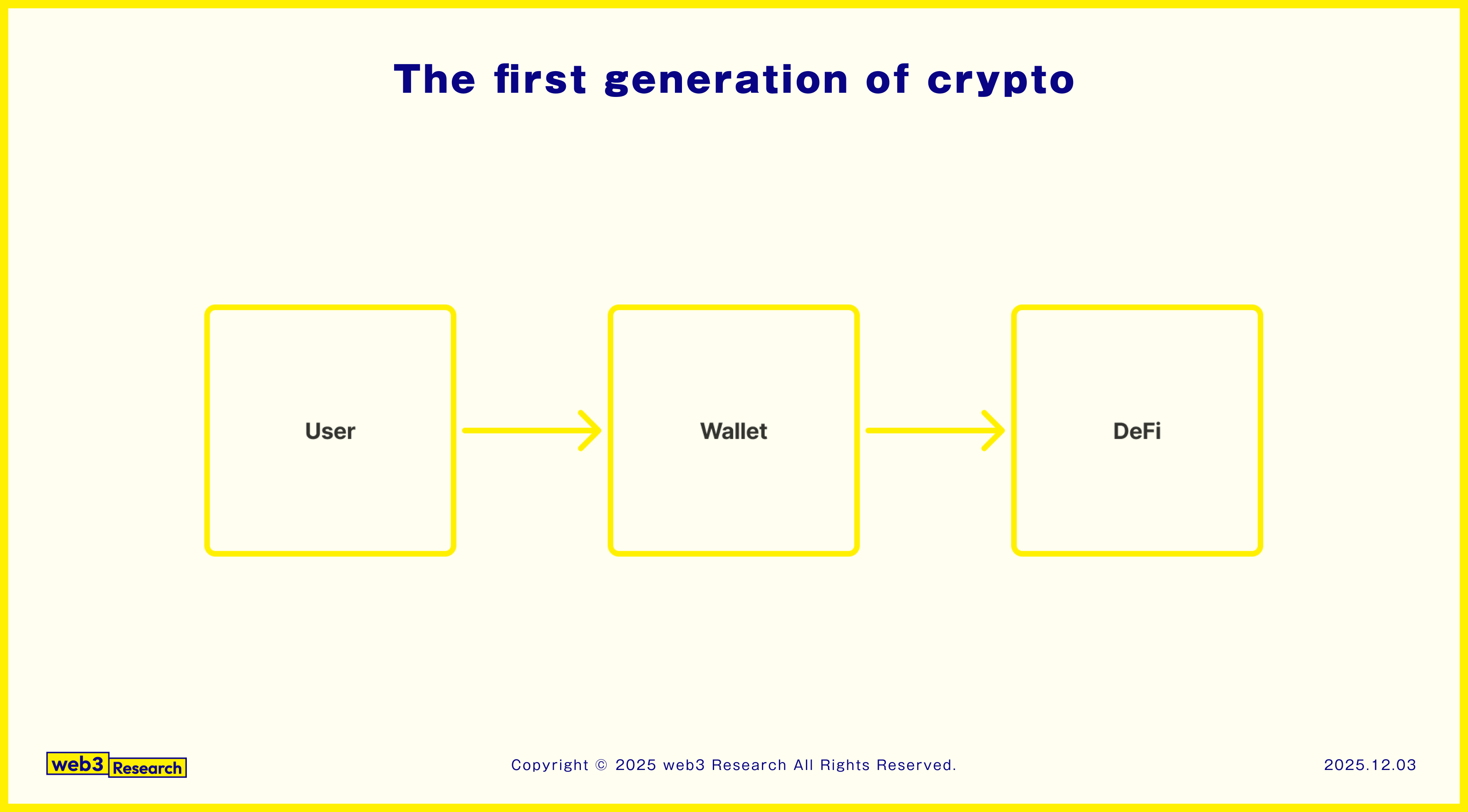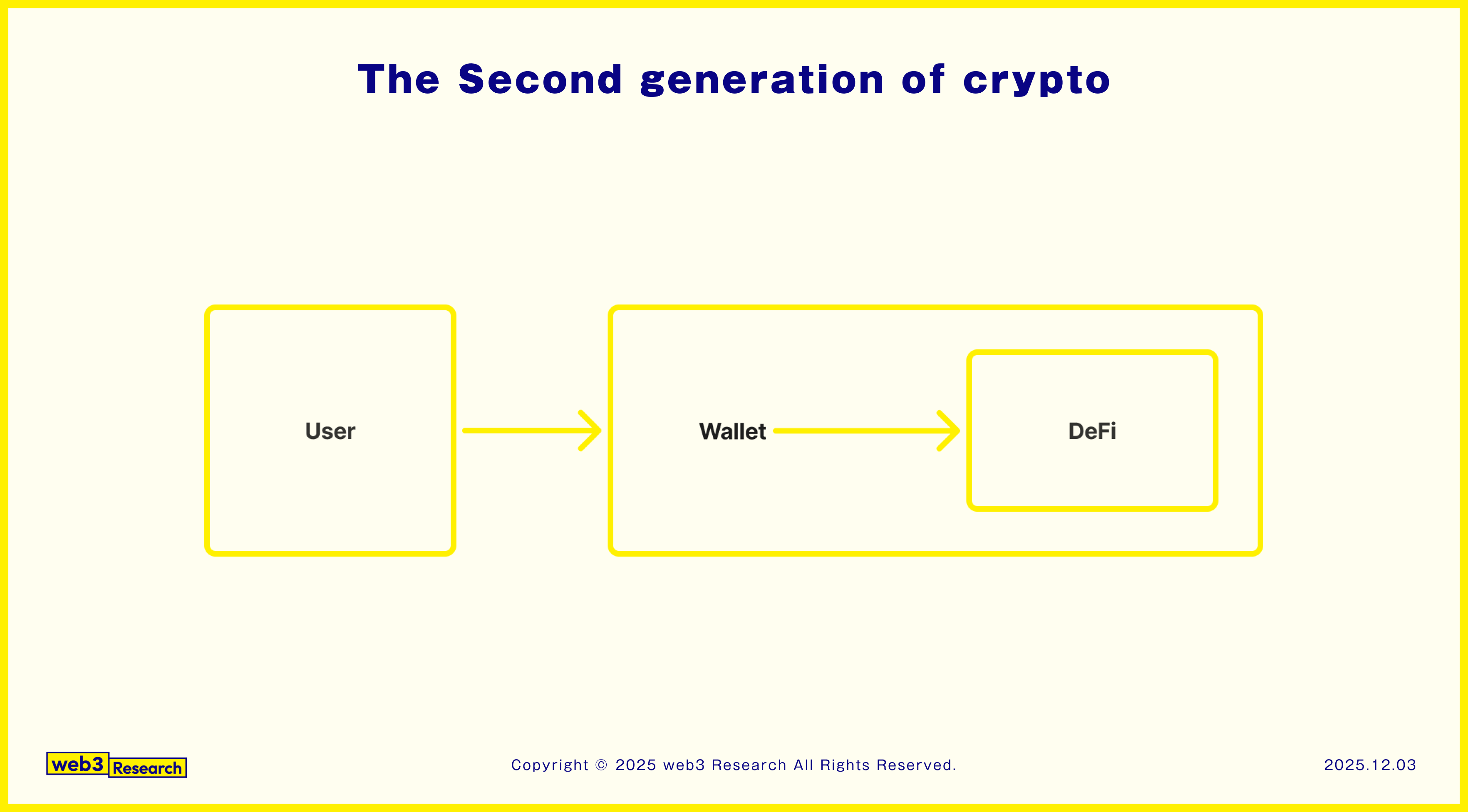 まず第一世代は非常にシンプルで、ユーザーがMetaMask等のウォレットを利用して、DeFiに接続して利用します。これは今でも一般的な利用方法ですね。