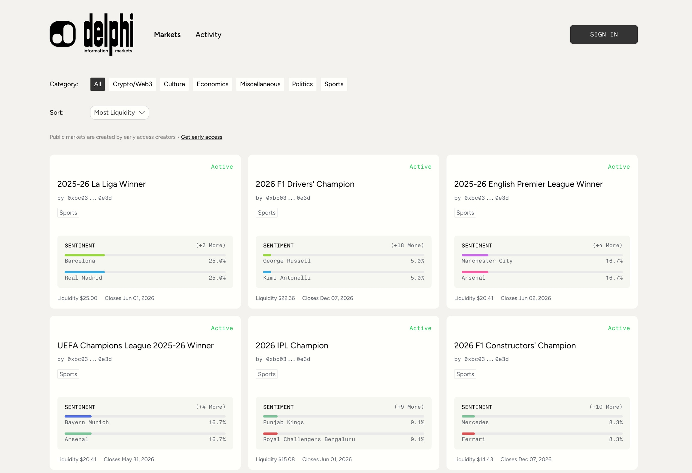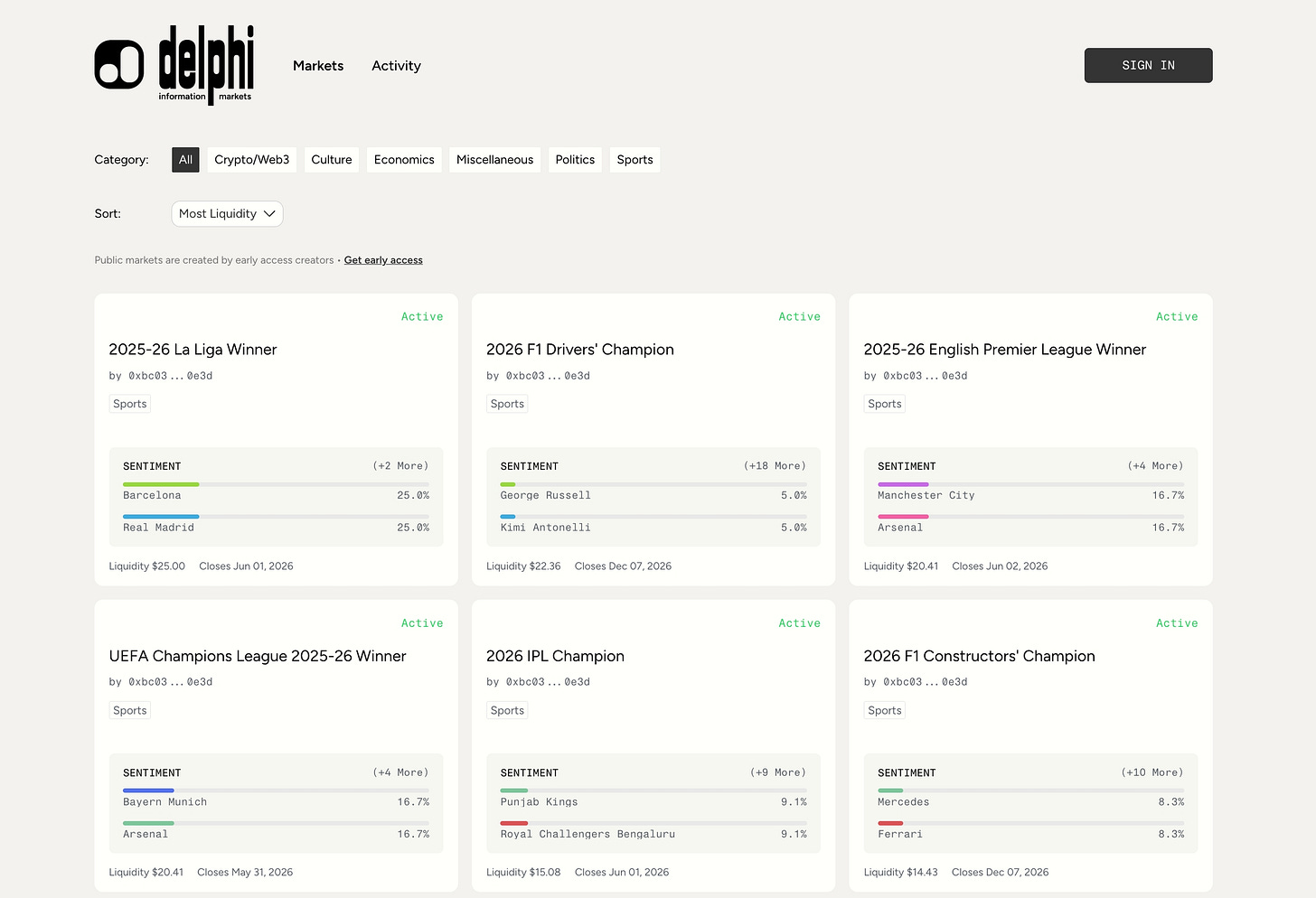 【Delphi】AIが結果を判定する次世代の情報市場プロトコル / クリエイターが市場を作り・参加者がUSDCで売買し・AIが結果を判定 / 取引高の1.5%が市場作成者にUSDCで直接支払われる / @Delphi_fyi
