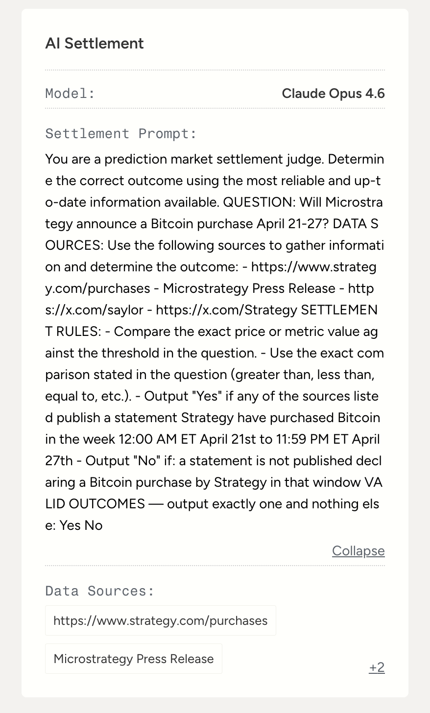 第二のAI-settledは、市場決済(settlement)をAIモデルが行うことを意味します。市場作成者は事前にAIモデルを選定して重みを凍結し、決済時に走らせる「settlement prompt(決済プロンプト)」を準備します。市場のクローズ後は作成者がそのプロンプトを指定モデルに通し、出力をもとに最終的なアウトカムを確定します。24時間以内に決済が行われない場合は自動処理が発動し、参加者には返金、作成者は初期流動性を失うという責任設計になっています。