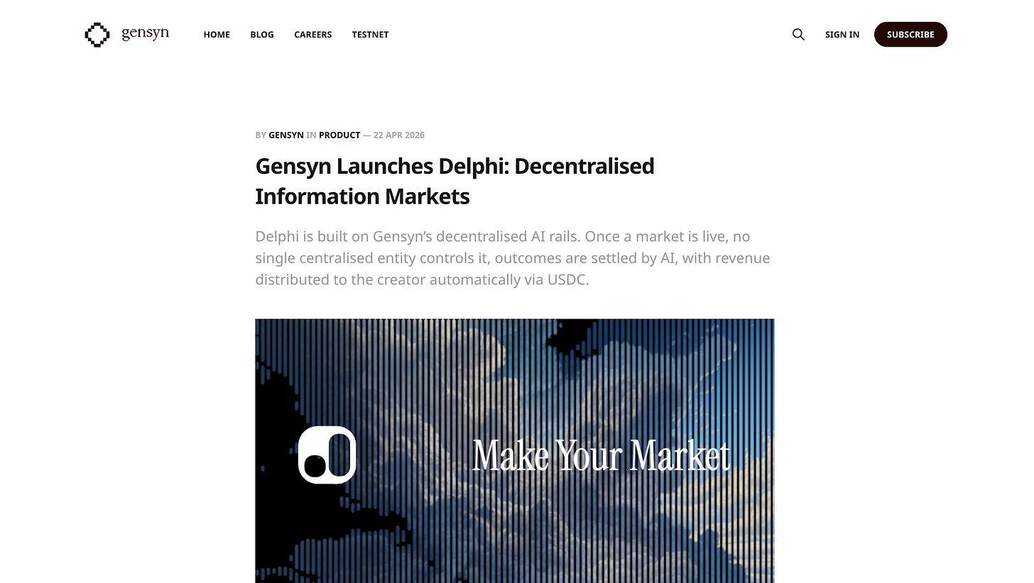 Delphiは、Gensynが2026年4月22日にメインネットローンチしたAI判定型の情報市場プラットフォームで、クリエイターが市場を作り・参加者がUSDCで売買し・AIが結果を判定するという設計により、PolymarketのUMAオラクルやKalshiの社内裁定とは異なる新しい予測市場の形を打ち出している。