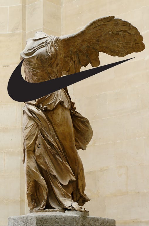 有名な話ですが、NIKEは”勝利の女神ニケ”の彫像の翼をモチーフにしたロゴマークにしています。