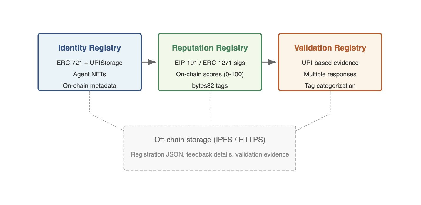 ERC-8004は3つの軽量なオンチェーン・レジストリ(Identity、Reputation、Validation)を提供し、それ以外のアプリケーション固有ロジックはオフチェーンに委ねるアプローチを取っています。必要最低限のデータのみオンチェーンに保持しつつ柔軟な信頼モデルを構築します。