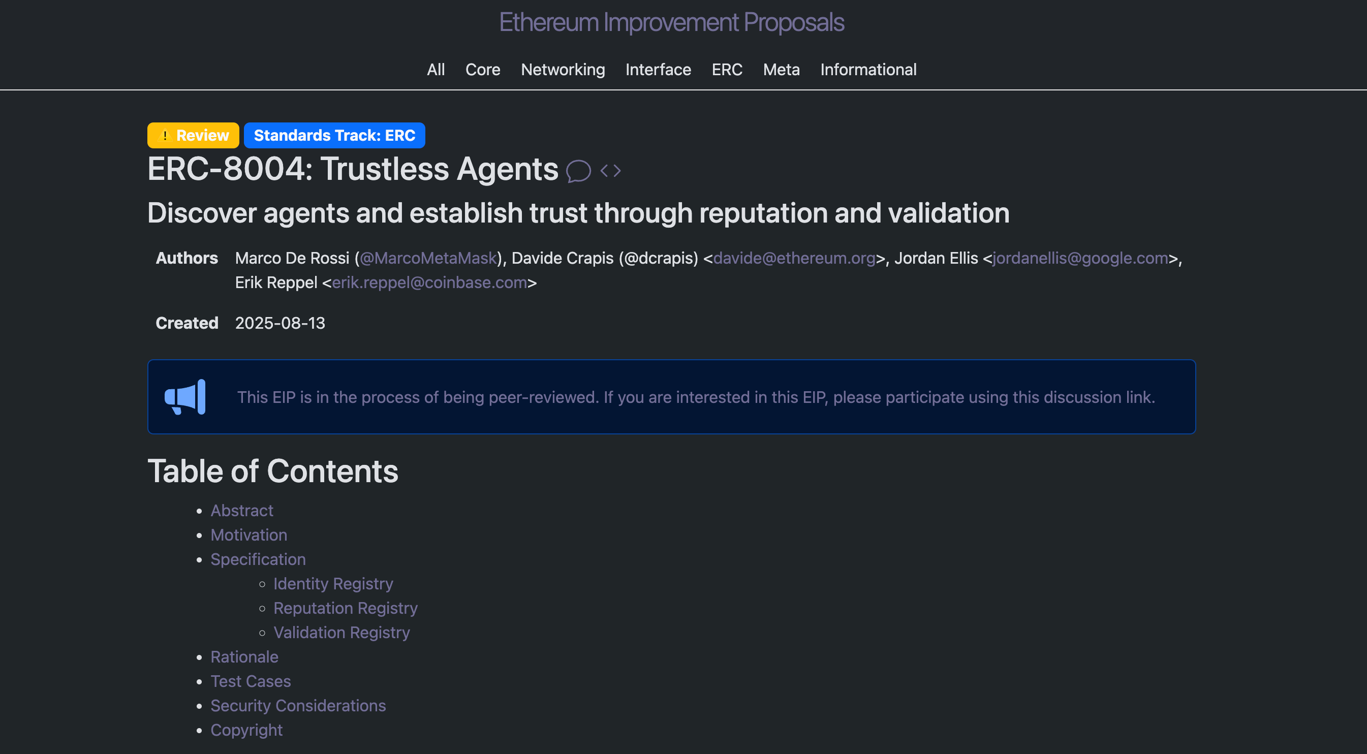 そして、約2か月のピアレビューとテスト運用を経てv1.0が2025年10月中旬に完成しました。Marco De Rossi氏(MetaMask)、Davide Crapis氏(Ethereum Foundation)ら提案者は「8月の草案から6週間で数百人の研究者・業界リーダーのフィードバックを反映し、大幅改善した」と述べています。
