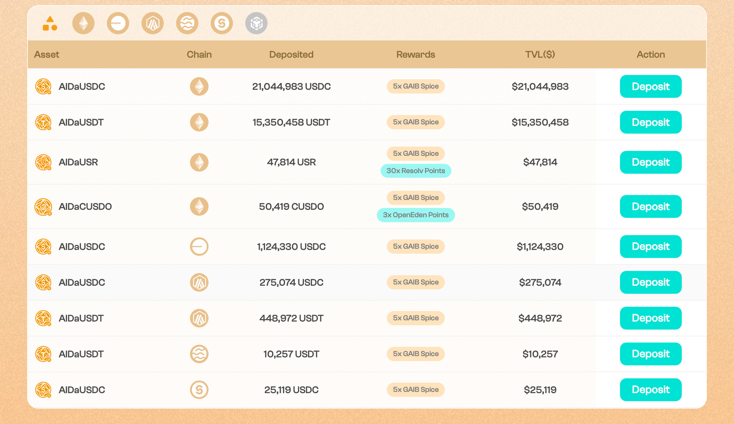この発表を受け、2025年5月には「AID Alpha」と呼ばれる先行提供プログラムをローンチします。ユーザーはUSDC/USDTを預けて「AIDa」トークンを受け取り、日次でポイント「Spice」を獲得することが可能になりました。
