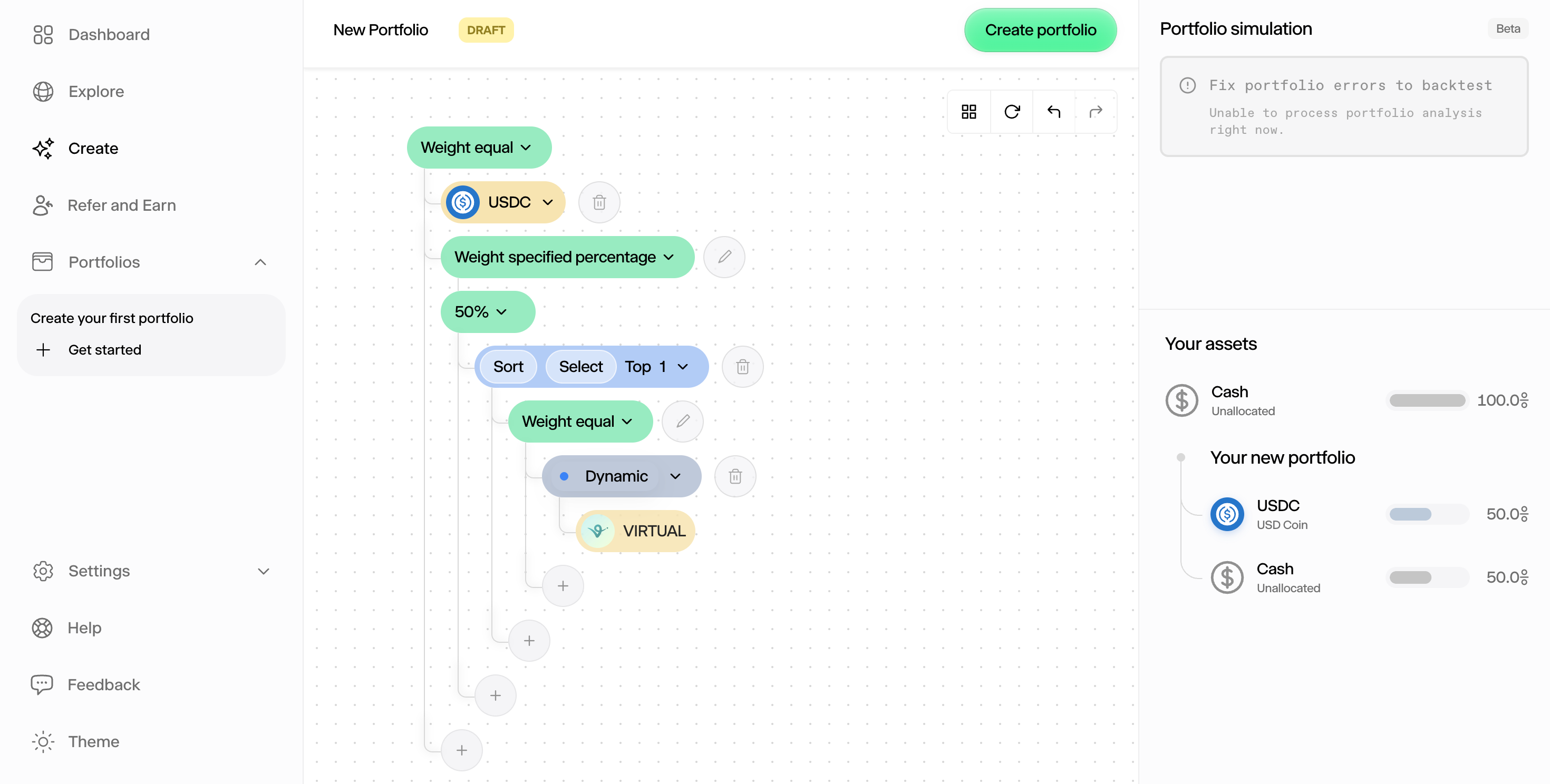 AIによる自動運用ではなく、ユーザーがオンチェーン上で複数の資産によるポートフォリオ(分散投資のインデックスのようなもの)を自身で作成することができ、自動リバランスによって戦略通りに資産配分を維持できることが最大の特徴です。