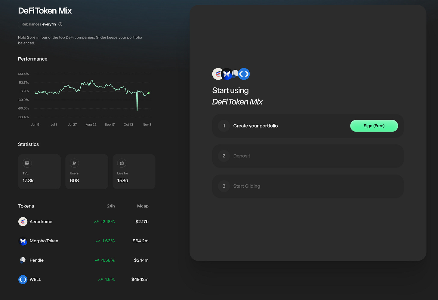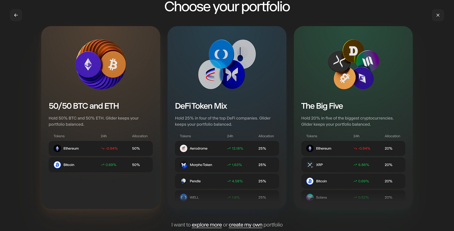 Gliderは、ユーザー自身がオンチェーン上で複数資産のポートフォリオを作成し、自動リバランスによって戦略的に運用できる分散投資プラットフォーム。 ノーコードで投資ロジックを構築でき、個人専用ETFのように機能します。