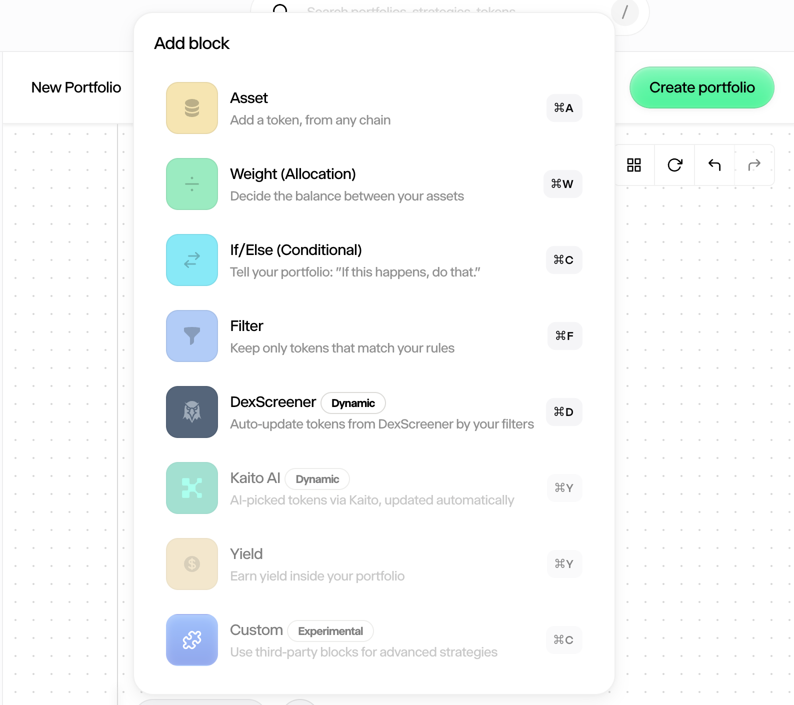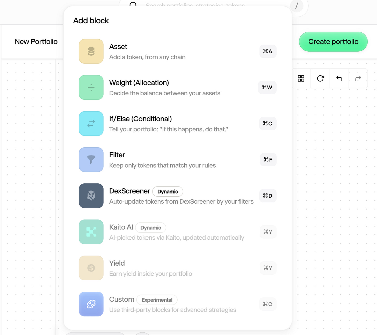 Assetブロック:ポートフォリオに組み入れるトークンを追加します。現在対応するチェーン上の任意のトークンを選択可能で、複数チェーンにまたがる資産も一元的に扱えます。