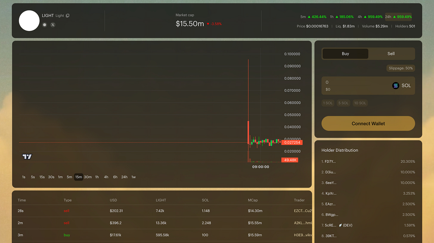 ICO時の開幕時価総額は調達総額と等しく設定され(1ドル出資につき1ドル相当の$LIGHTが市場に供給)、公開直後の循環時価総額は約2,730万ドルに達しています。