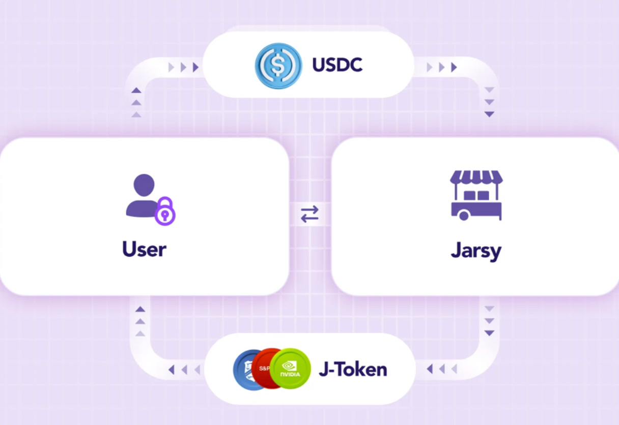 Jarsyのサービスは、オフチェーンの実世界資産(株式)とオンチェーンのトークンを結びつけるハイブリッド構造です。