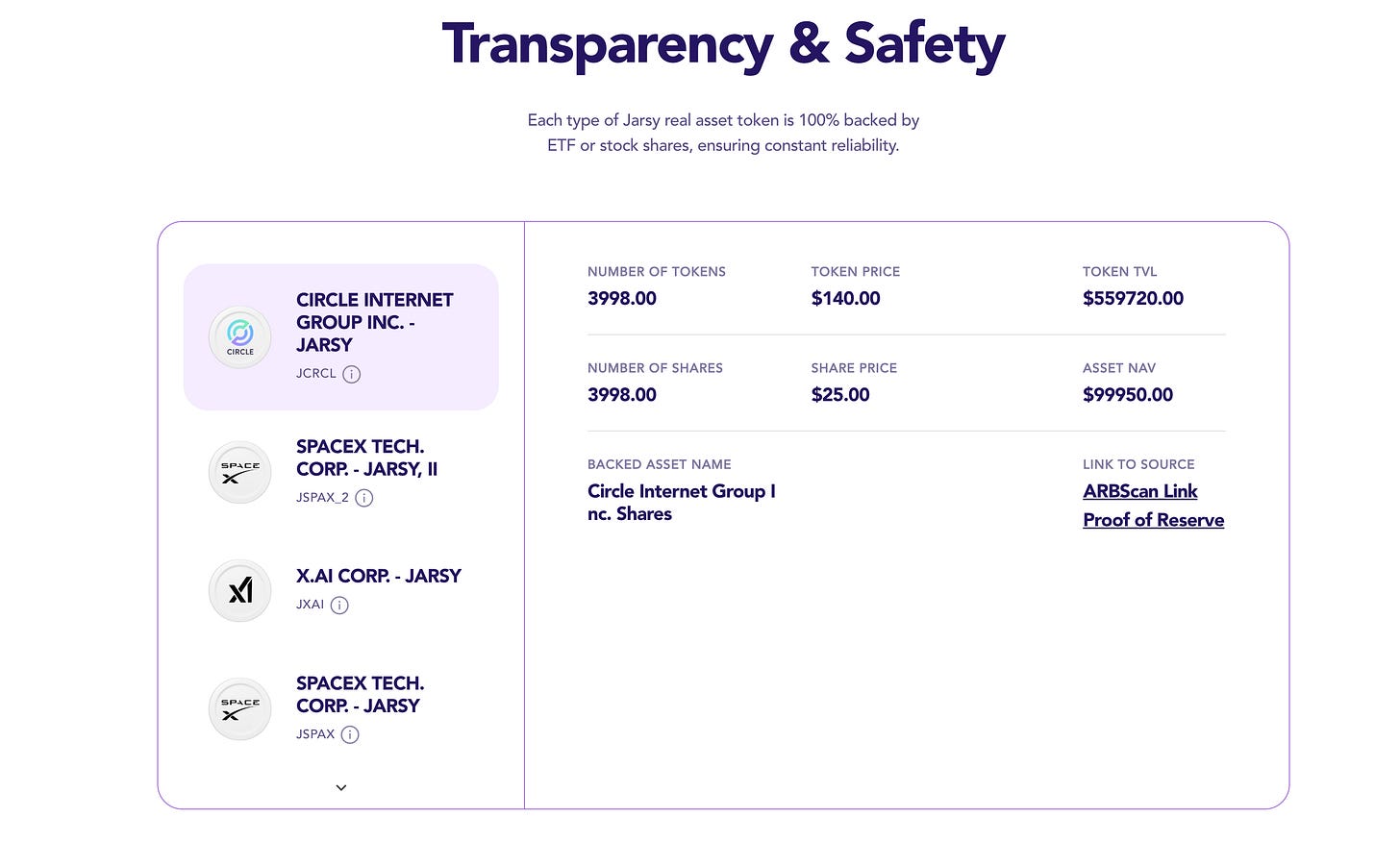 チェーンはArbitrumを利用しており、各投資対象ごとにERC-20規格のトークンが発行され(例: SpaceX株の「JSPAX」、Tesla株の「JTSLA」など)、1トークンが実株1株に対応する仕組みです。
