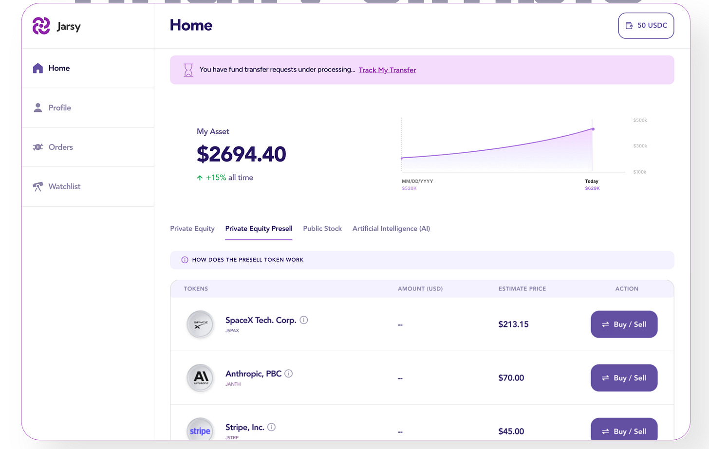 「Jarsy」は、トークン化された未上場株に投資することを可能にするプラットフォームです。従来、これら未上場株への投資は限られたVCや投資家に限定されていましたが、「Jarsy」を利用するとユーザーはわずか10ドルから、SpaceX、Anthropic、Stripe等の未上場の株式に投資することが可能です。