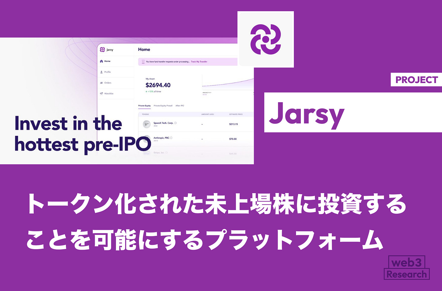 Project【Jarsy】トークン化された未上場株に投資することを可能にするプラットフォーム / 10ドルから、SpaceX、Anthropic、Stripe等の未上場の株式に投資 / @JarsyIncトレンドの1つですね。mitsuiJul 17, 2025∙ Paid3Shareおはようございます。web3リサーチャーのmitsuiです。今日は「Jarsy」についてリサーチしました。🟪Jarsyとは?⚙️変遷と透明性と規制対応💬未上場株のセカンダリーマーケット市場は非常に大きいSubscribeThis post is for paid subscribersSubscribeAlready a paid subscriber? Sign inPreviousNext