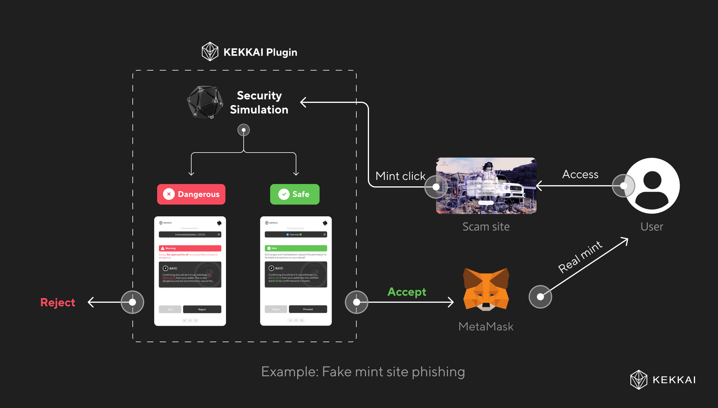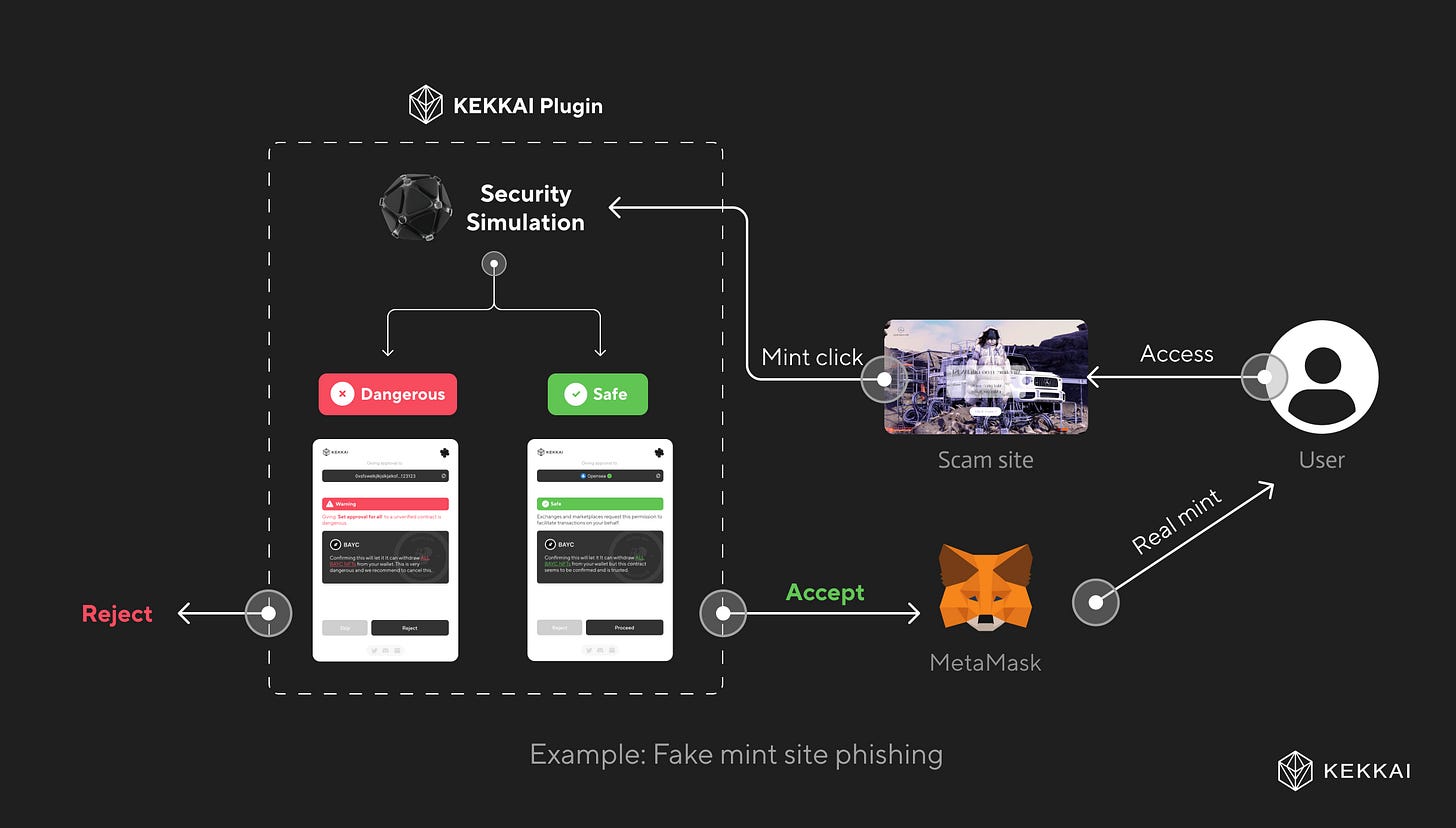 この課題解決を行ないのがKEKKAIです。知らず知らずのうちにトランザクションに署名することを避け、ウォレット実行前にその取引を分析してくれます。