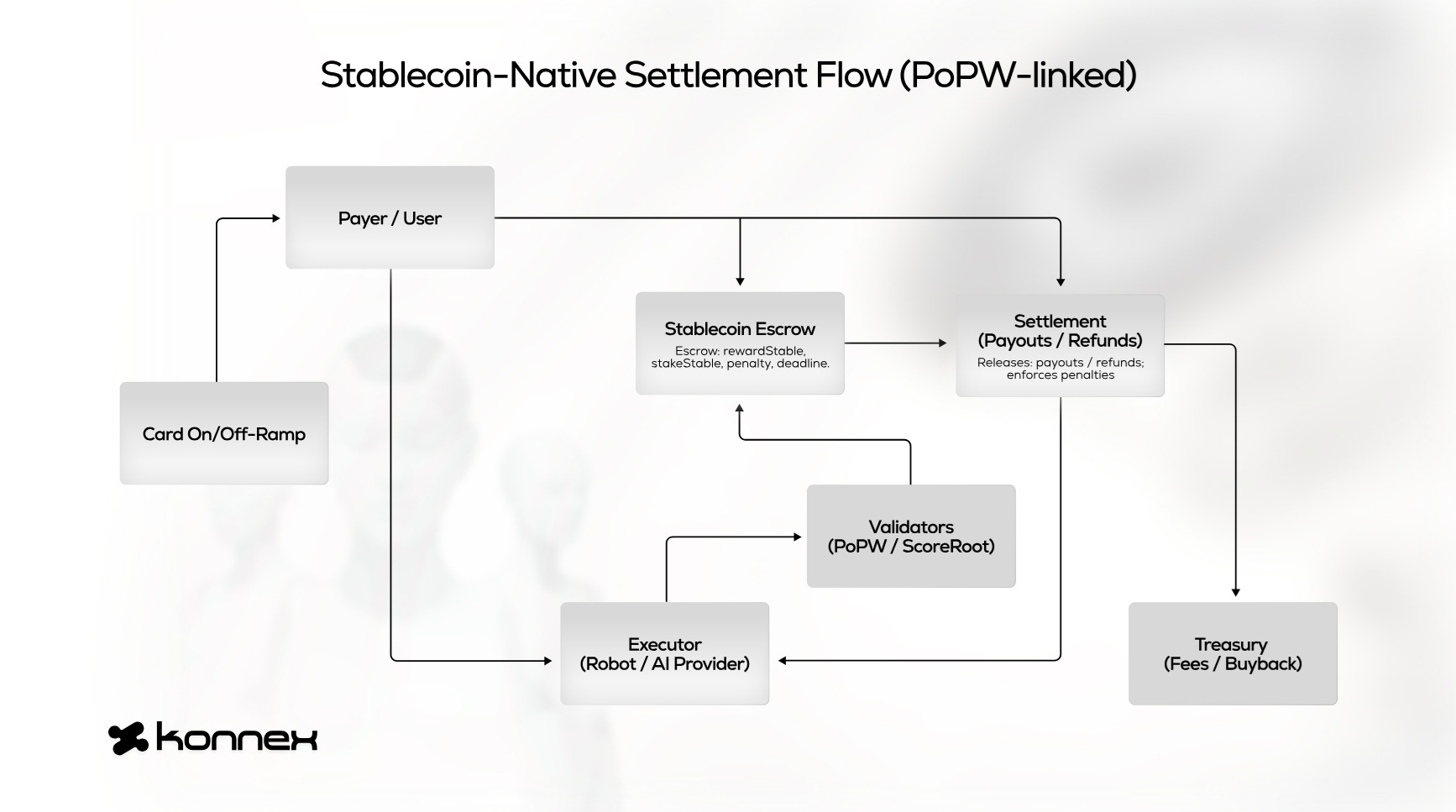 ステーブルコインによる実務決済とKNXトークンによる検証・ガバナンスを分離した設計で、現実世界の労働をスケールさせることを目指す