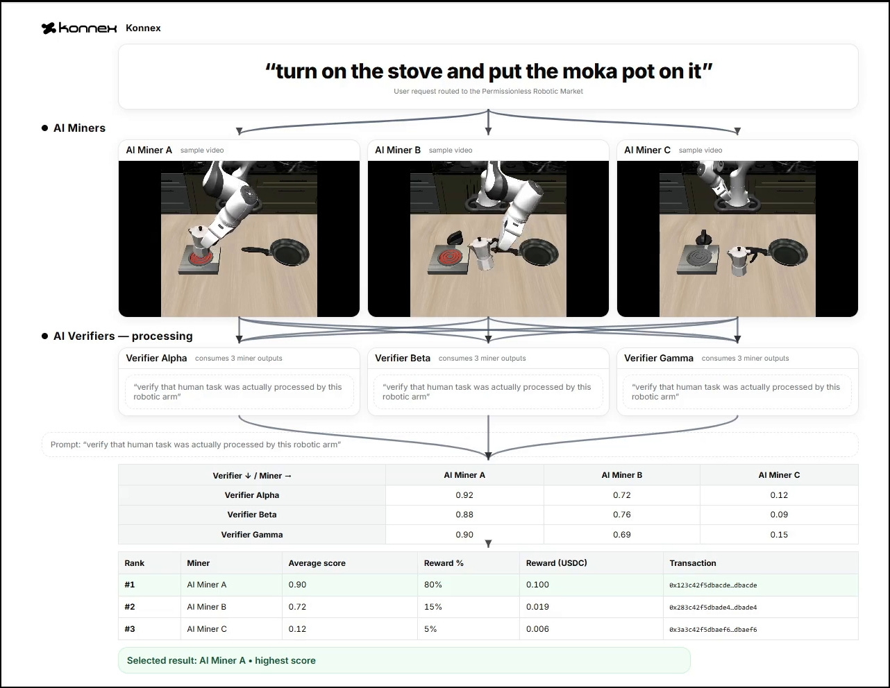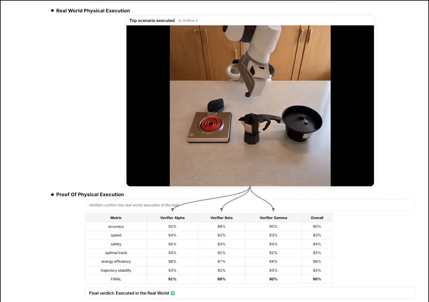 例えば、あるタスク(例:スープを作る)が投稿されると、バックエンドでは複数のAI開発者(ポリシー提供者=“AIマイナー”)が自分の制御アルゴリズム・AIモデルを提案し競合します。