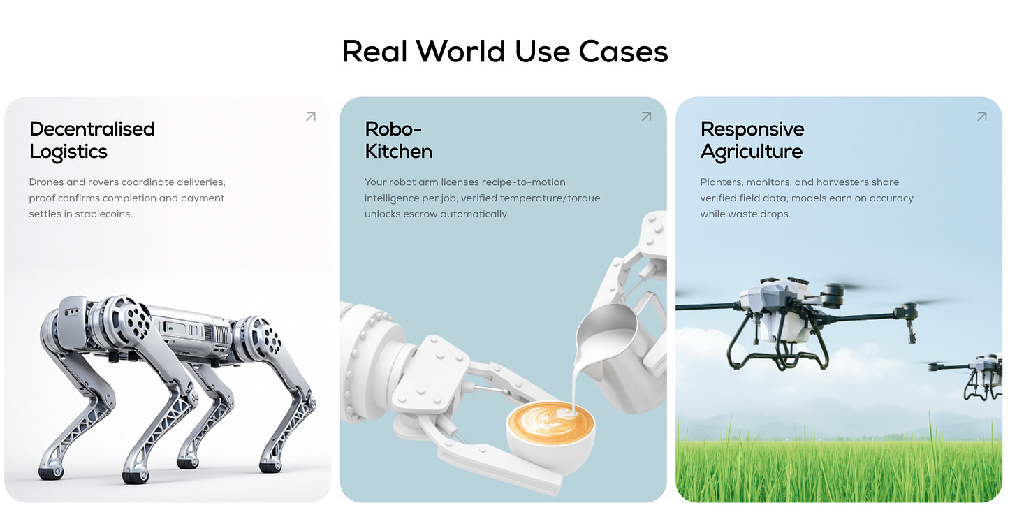 プラットフォームのビジョンは「物理労働をソフトウェアと同じ流動性でスケールさせる」ことであり、従来は人手に頼っていた様々な現場作業を自律ロボットとブロックチェーンによって代替・効率化することを目標に掲げています。