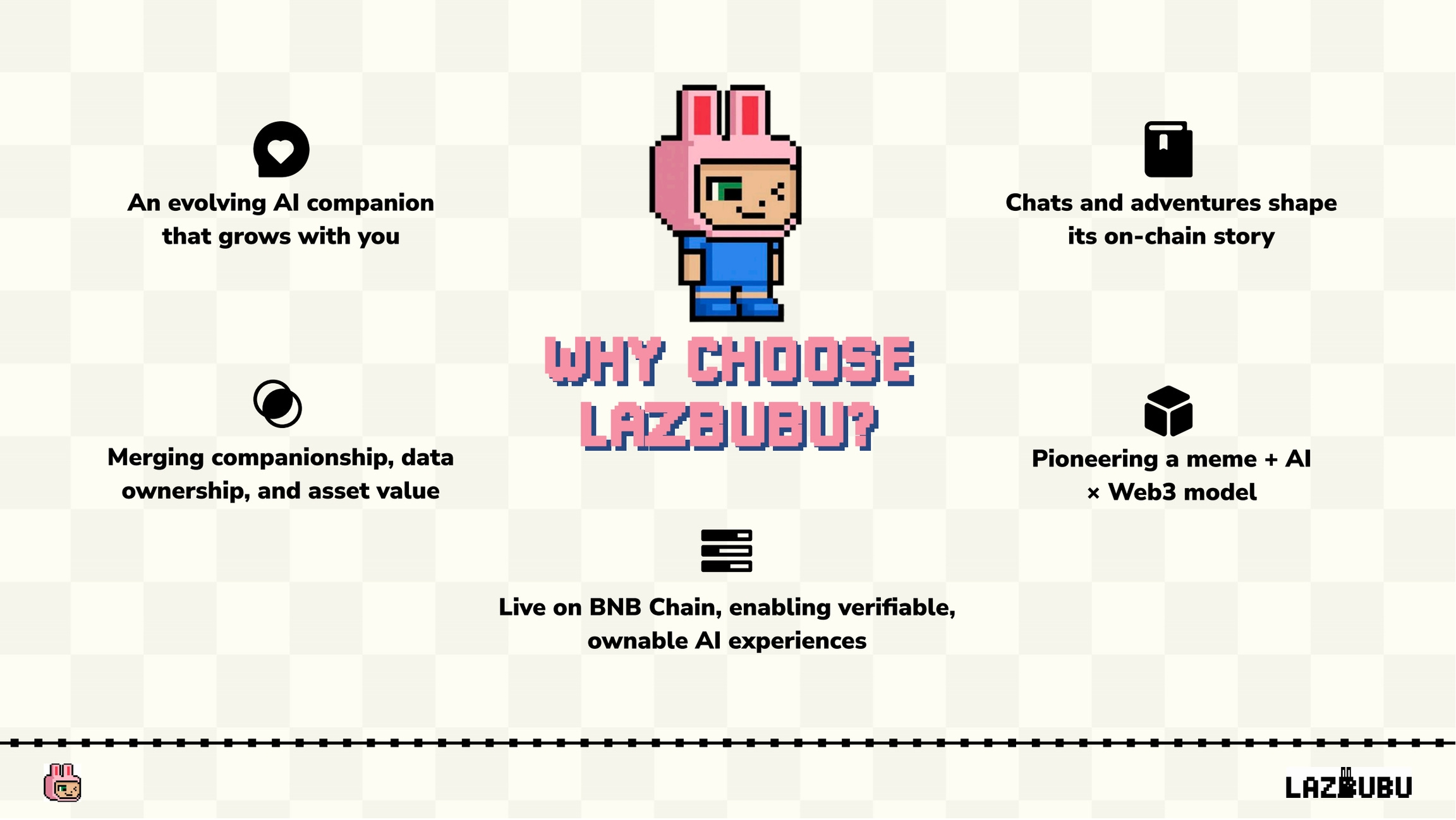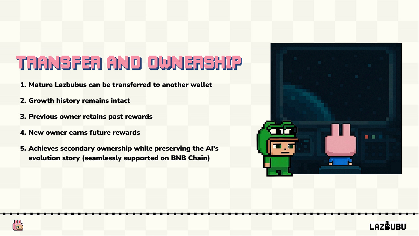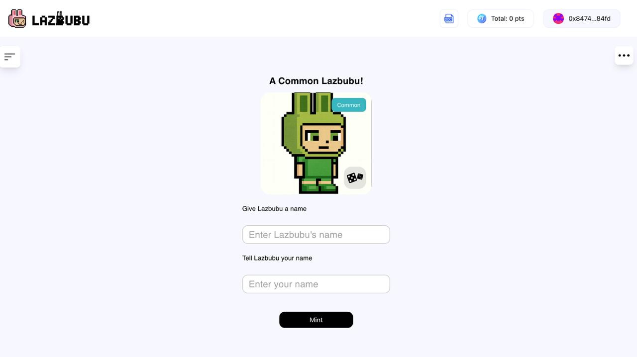 まとめると、Lazbubuはユーザーと共に成長する進化するAIコンパニオンです。チャットや冒険が、オンチェーンの成長ストーリーを形作り、全てがオンチェーンに刻まれて所有することが可能になります。